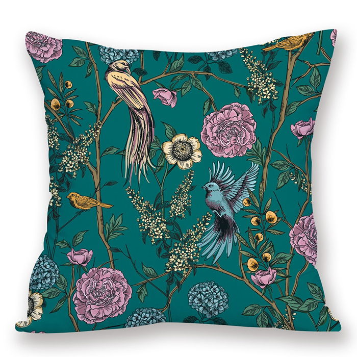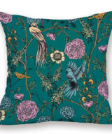Deze trendy kussenhoes Birds Turquoise met een print van bloemen en vogels op een turquoise achtergrond is erg mooi op de bank, in een stoel of op je bed! De kussenhoes heeft aan de voorkant een print van vogels en bloemen en is aan de achterkant effen naturel.