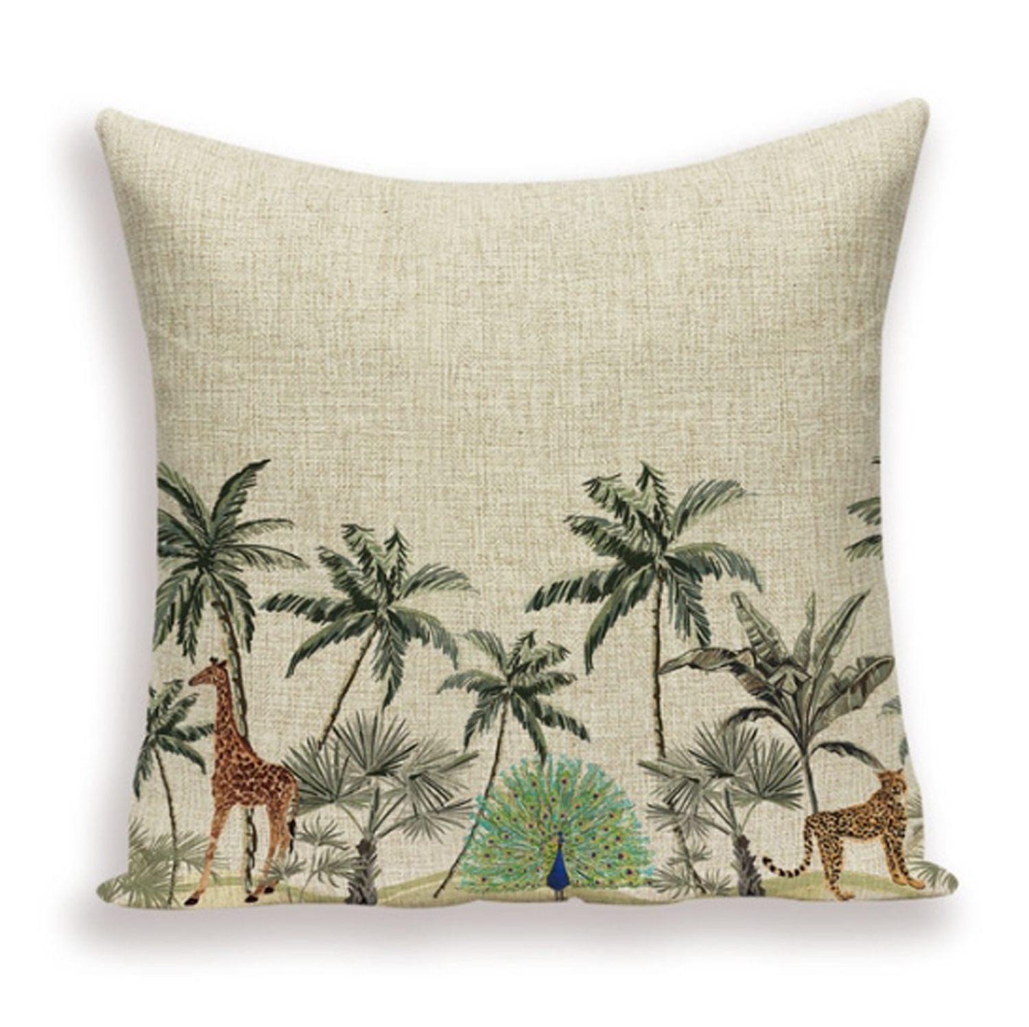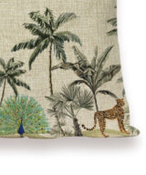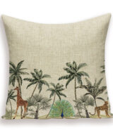 De kussenhoes heeft aan de voorkant een print van palmbomen en jungle dieren en is aan de achterkant effen naturel