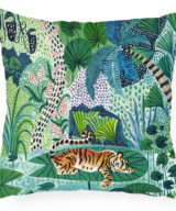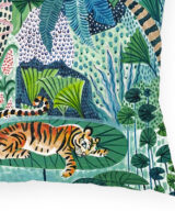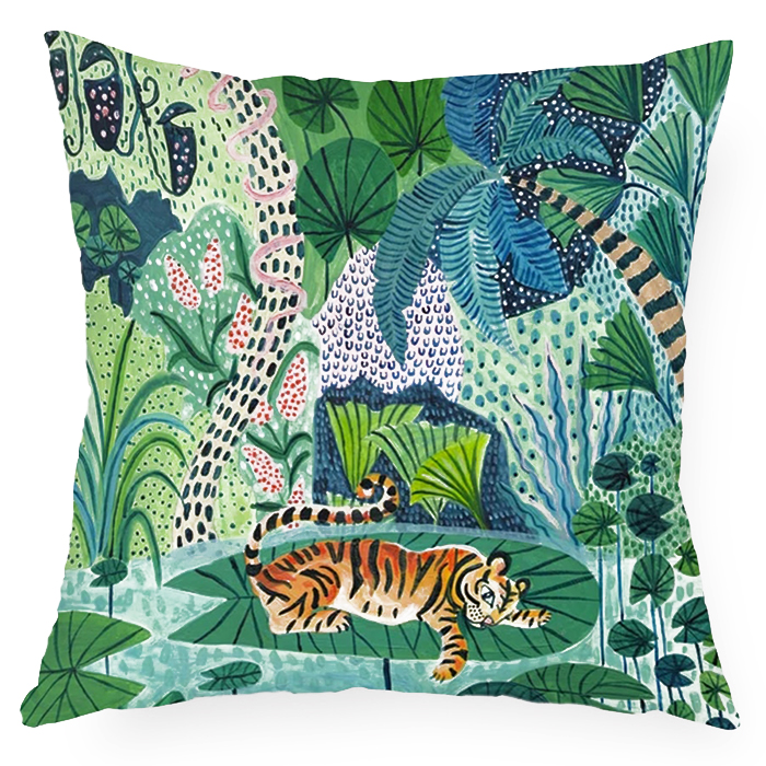 De kussenhoes heeft aan de voorkant een print met een tijger en bladeren en is aan de achterkant effen wit.