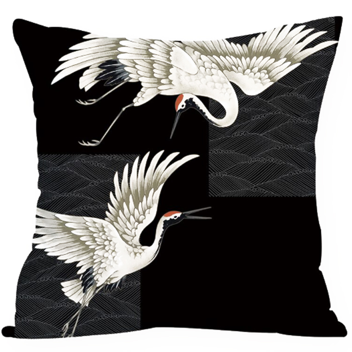 Deze kussenhoes van katoen heeft een eenzijdige print van 2 kraanvogels, de achterkant is egaal zwart.