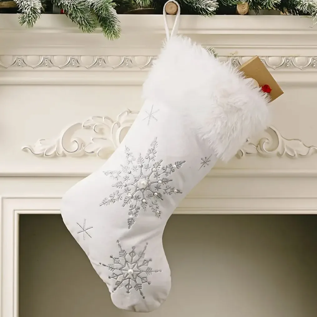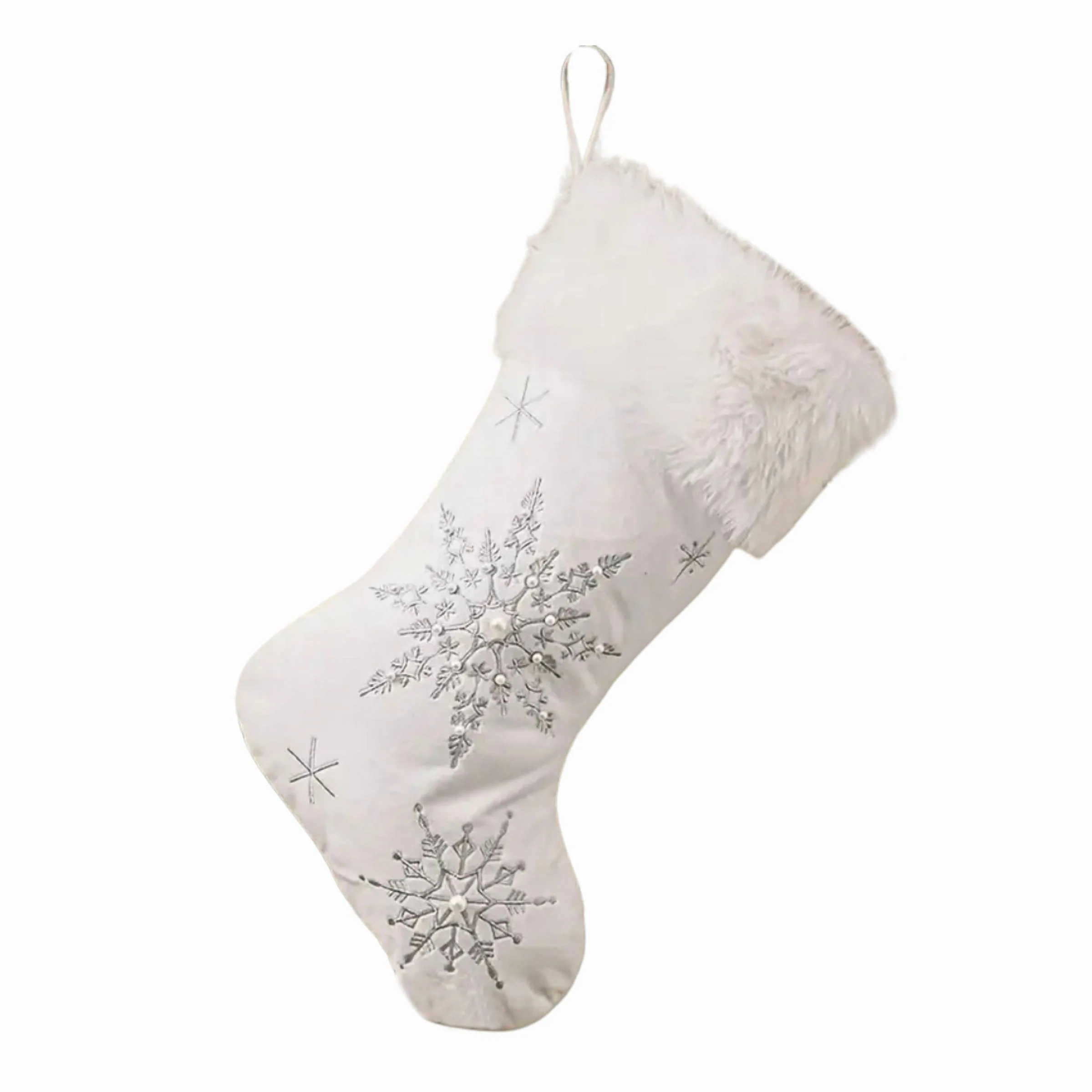 Breng de magie van de kerst in huis met deze prachtige kerstsok Snowflake Zilver! Deze feestelijke kerstdecoratie is voorzien van een stijlvolle ophanglus, zodat je hem eenvoudig kunt ophangen aan de open haard, deur of muur. De witte kerstsok XL heeft een opvallende eenzijdige print van zilveren sneeuwvlokken afgewerkt met strass parels.