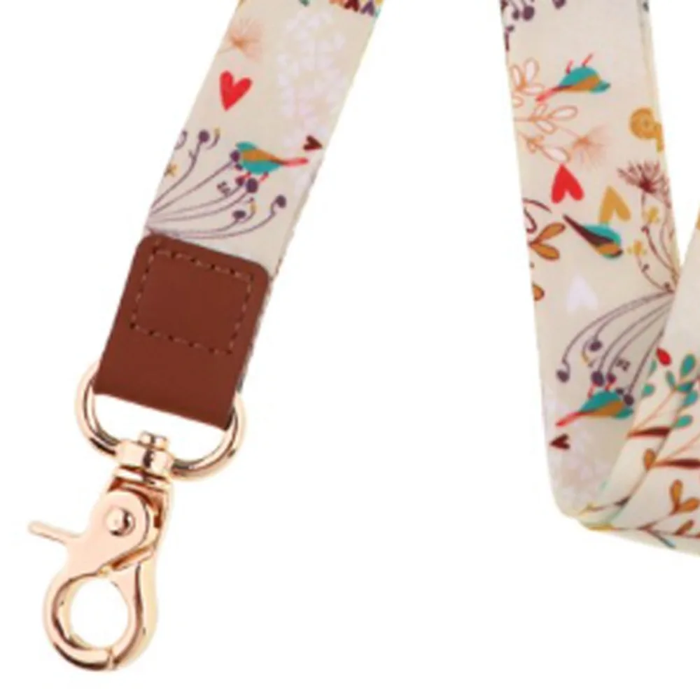 Dit stevige keycord met een mooie print van vogels en hartjes is voorzien van een metalen haaksluiting en een telefooncord.