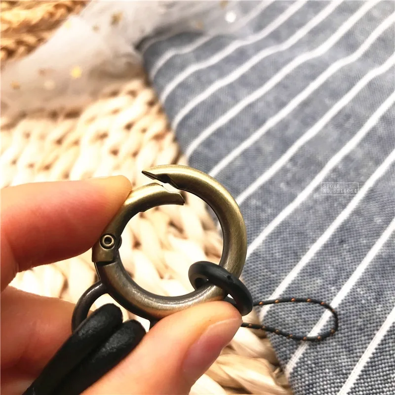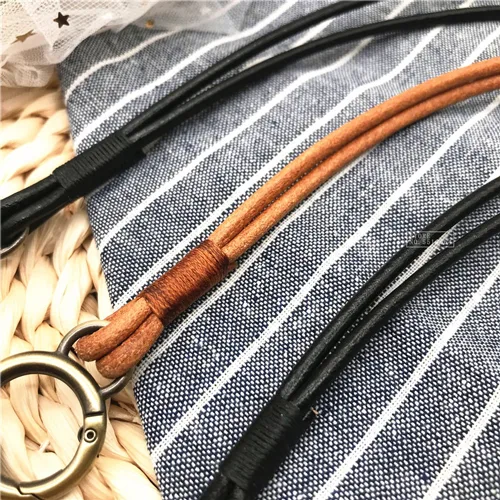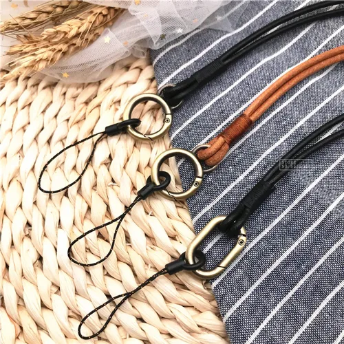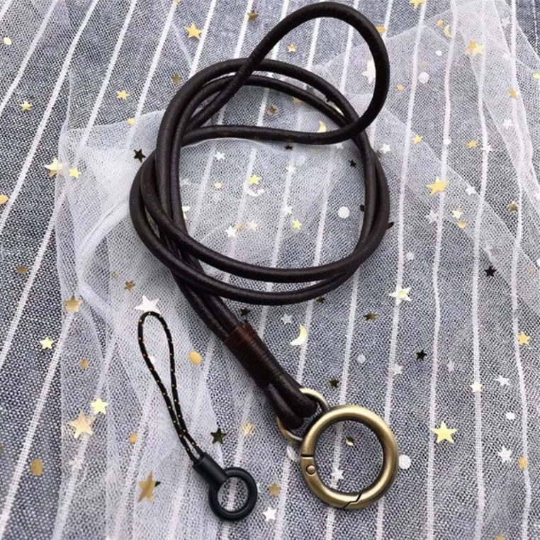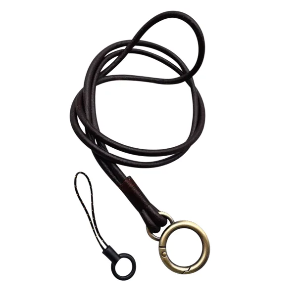 Dit stevige donkerbruine keycord van natuurlijk leer is voorzien van een bronskleurige haaksluiting en een telefooncord.