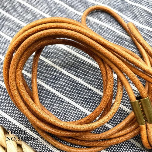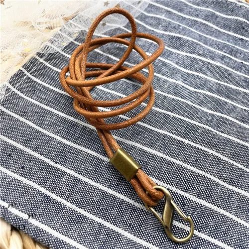 Dit stevige lichtbruine keycord van natuurlijk leer is voorzien van een dubbelzijdige bronskleurige haaksluiting en een telefooncord.