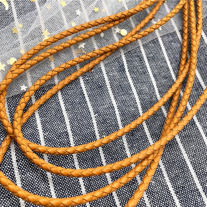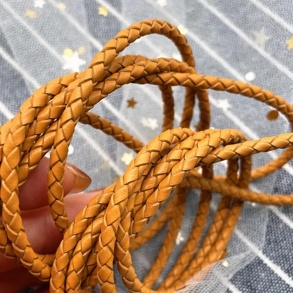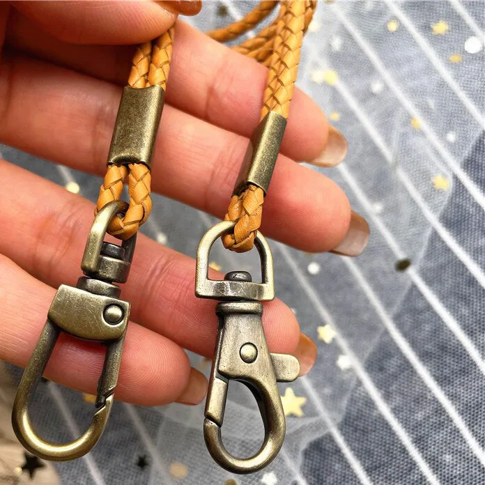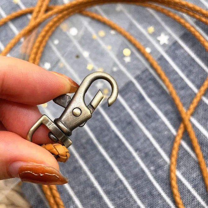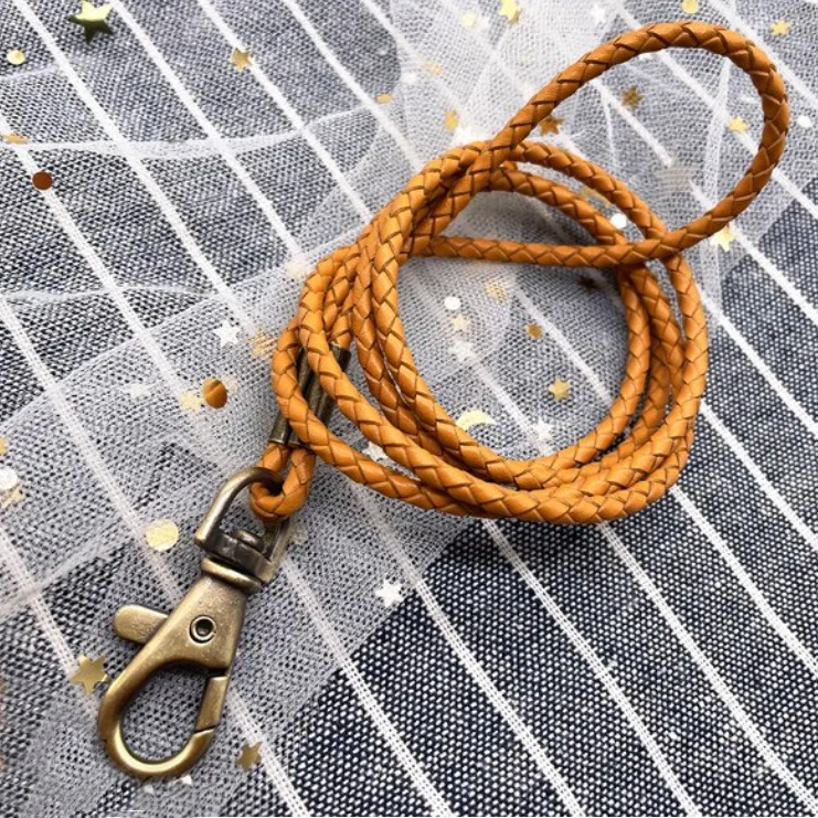 Dit stevige keycord van gevlochten lichtbruin leer heeft een koperkleurige haak en een telefooncord.