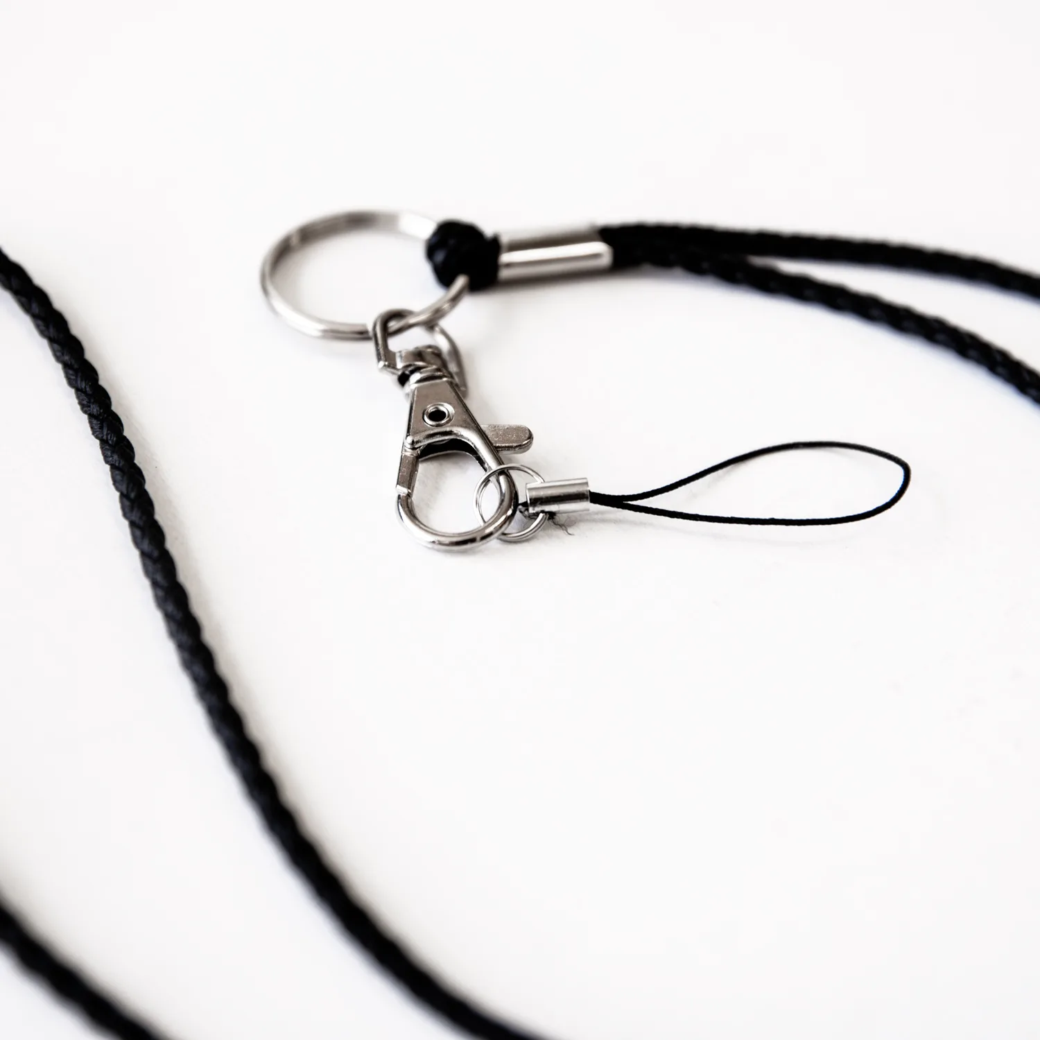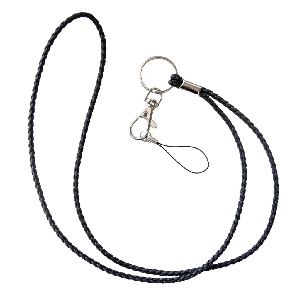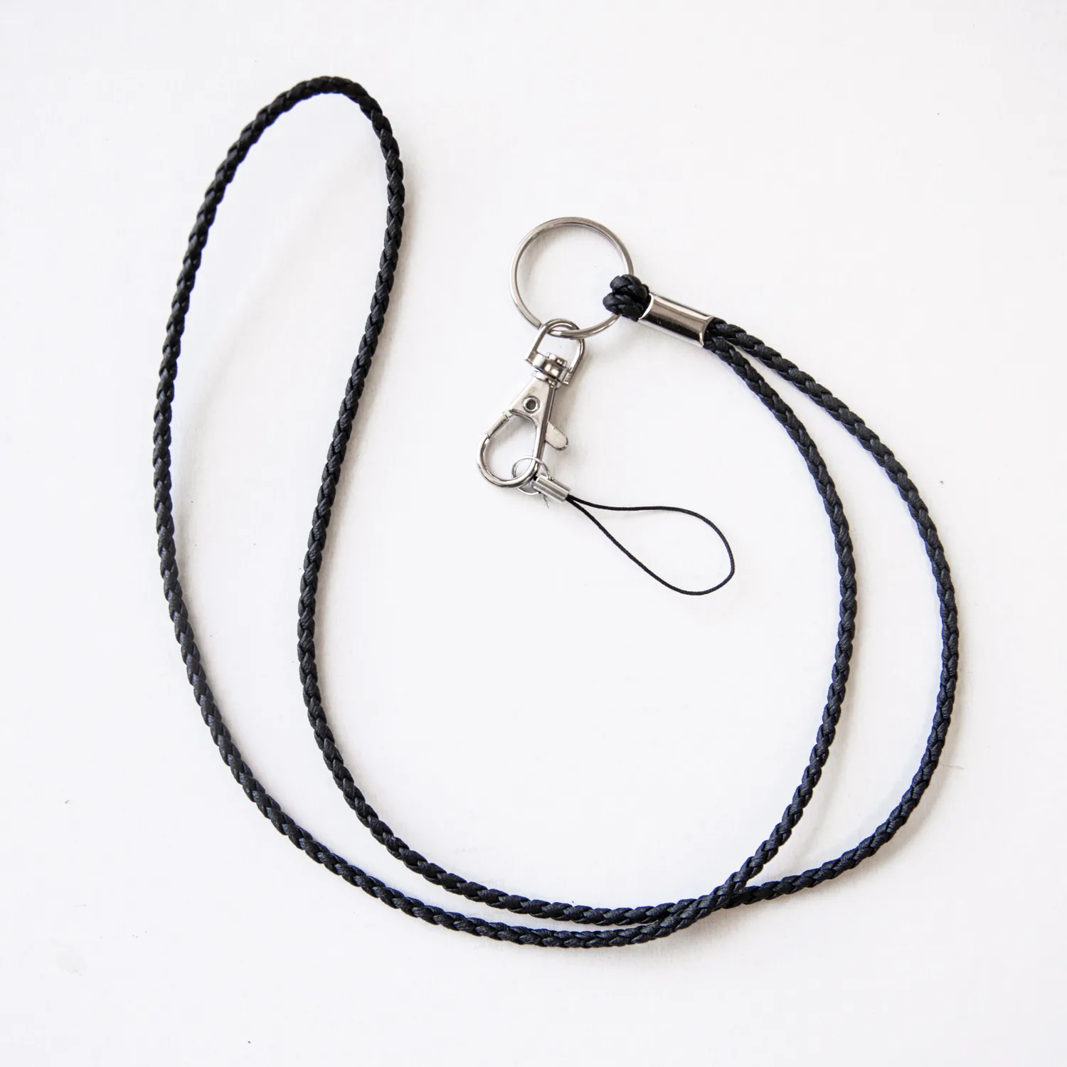 Dit stevige keycord van gevlochten zwart leer heeft een metalen karabijnhaak, een ring en een telefooncord.