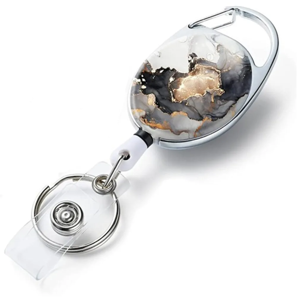 Op zoek naar een veelzijdige badgehouder die perfect past bij elke situatie? Deze hoogwaardige badgehouder RVS Black-Gold Marble van roestvrij staal en dik nylon telescopisch koord is voorzien van een clip aan de achterzijde voor moeiteloos dragen.