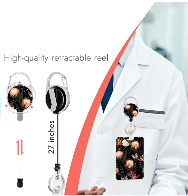 afrolbare badgehouder met bevestigingsclip en afrolmechanisme