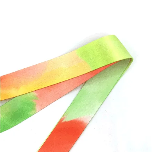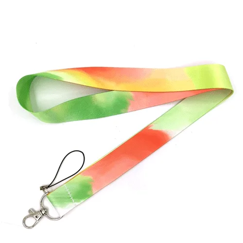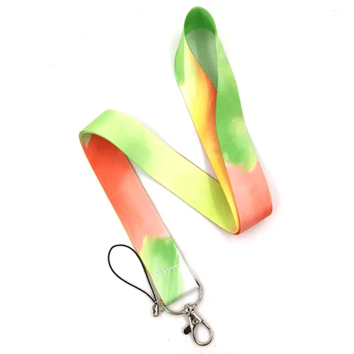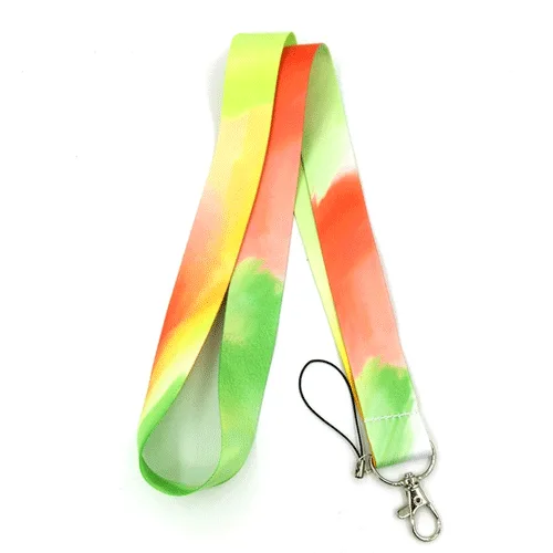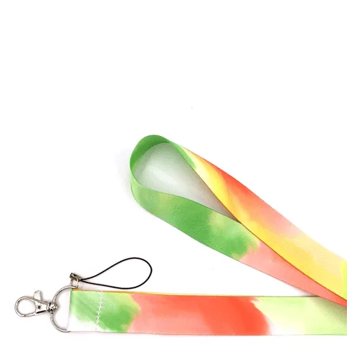 Dit stevige keycord met een mooie watercolor print in oranje, geel en groen is voorzien van een metalen haaksluiting en een telefooncord.