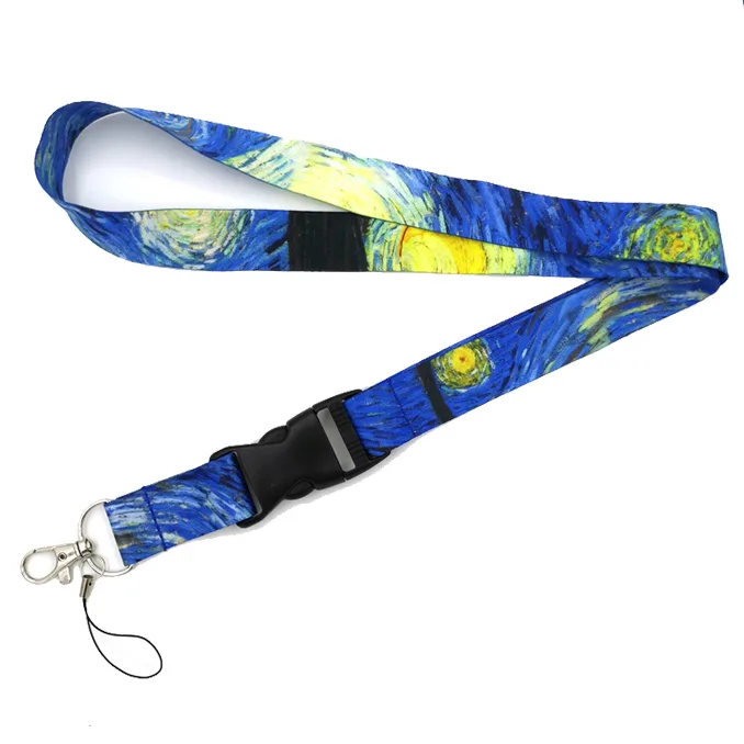 Dit stevige keycord met een mooie print van gebaseerd op het schilderij “De Sterrennacht” van Vincent van Gogh op een blauwe achtergrond is voorzien van een metalen haaksluiting en een telefooncord.