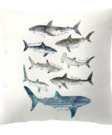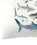 De kussenhoes is fluweelzacht en is aan 1 kant bedrukt met verschillende haaien op een witte achtergrond.