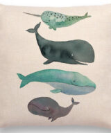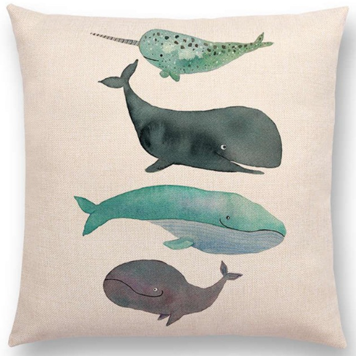 De kussenhoes is vervaardigd van canvas en katoen en is aan 1 kant bedrukt met een print van vrolijke walvissen. De achterkant van deze kussenhoes is effen naturel.