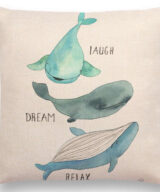 De kussenhoes is vervaardigd van canvas en katoen en is aan 1 kant bedrukt met een print van vrolijke walvissen. De achterkant van deze kussenhoes is effen naturel.
