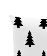 De kussenhoes is fluweelzacht en is aan 1 kant bedrukt met zwarte bomen op een witte achtergrond.