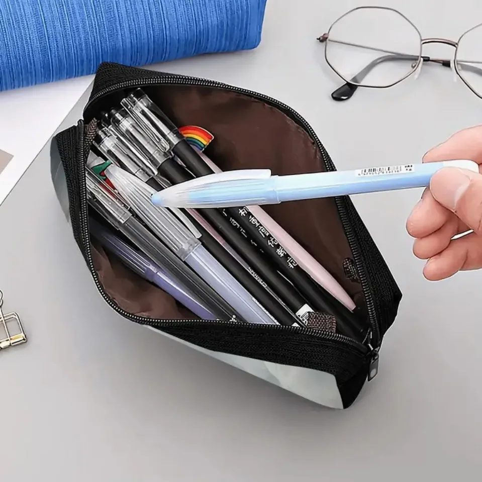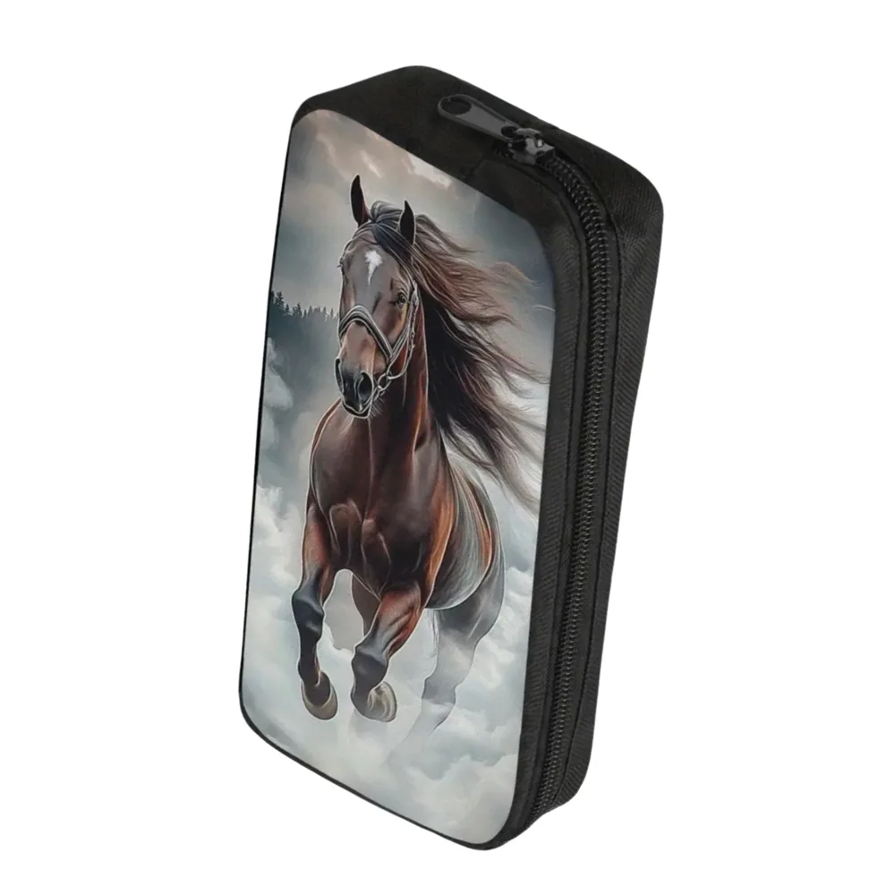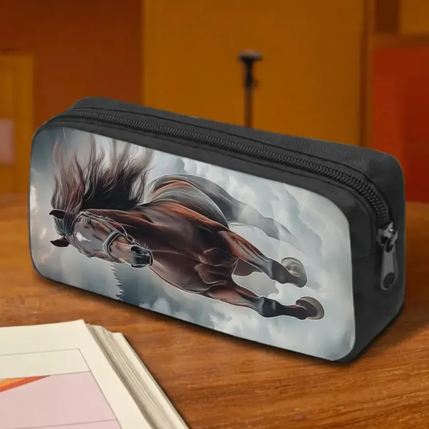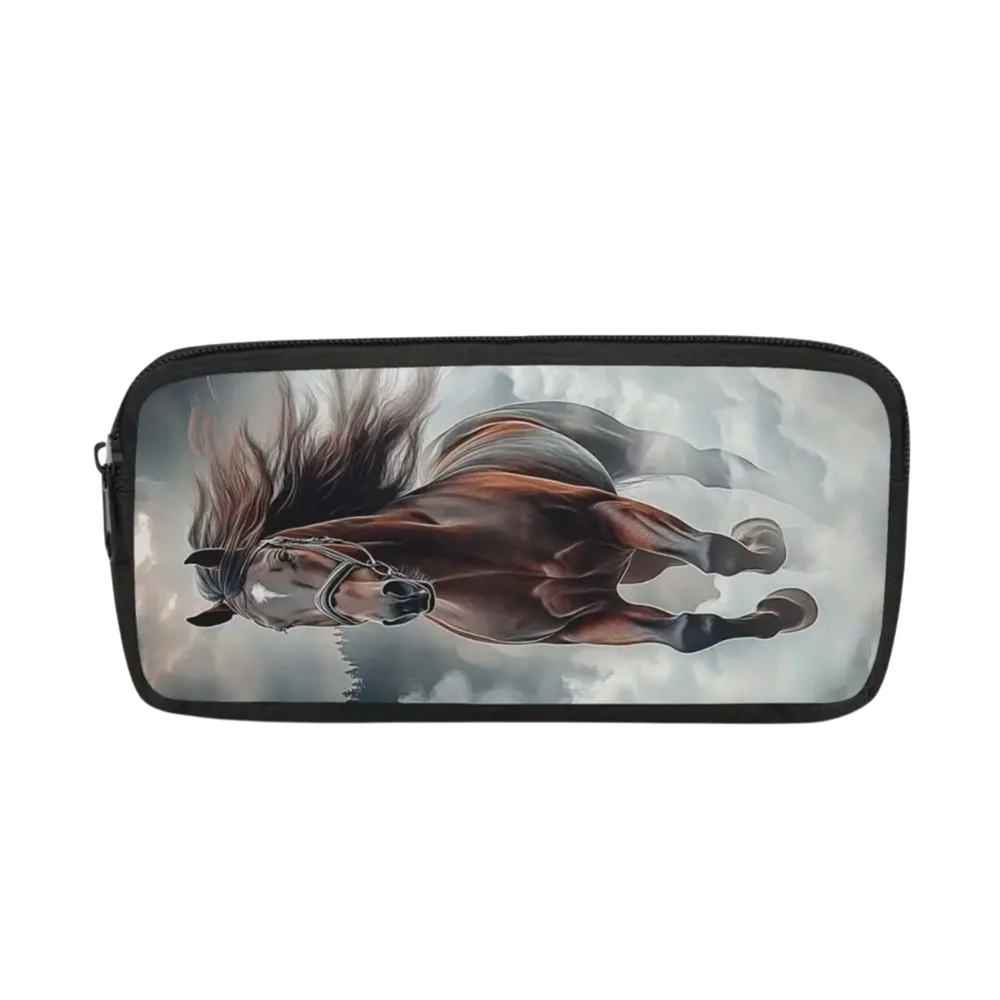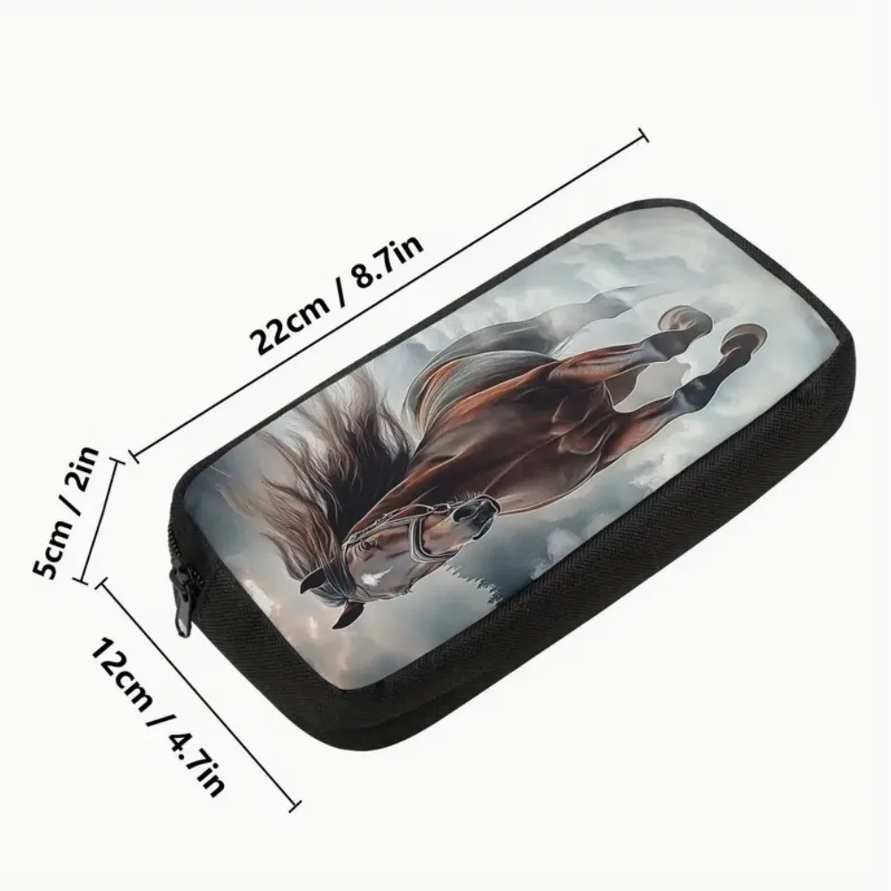 Het ontwerp van deze etui is geïnspireerd door de liefde voor paarden. De zwarte kleur met de opvallende eenzijdige print maakt het een echte blikvanger. Of je nu naar school gaat of gewoon je spullen wilt organiseren, deze etui voegt een speelse touch toe aan je dagelijkse routine.