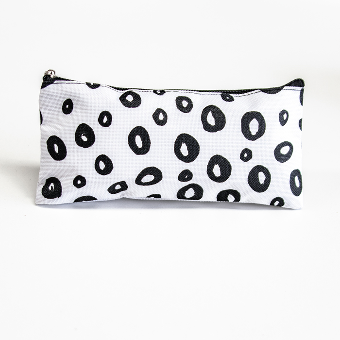 De tekenetui heeft een leuk patroon van zwarte stippen, handig voor je potloden en pennen.