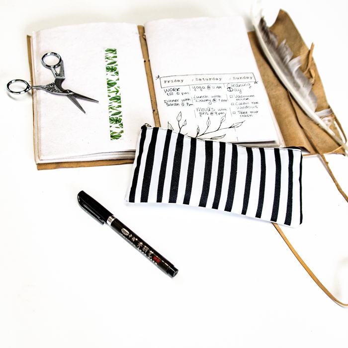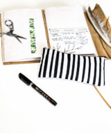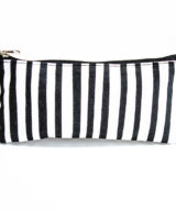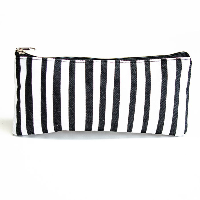 De schooletui heeft een leuk patroon van zwart met witte strepen.