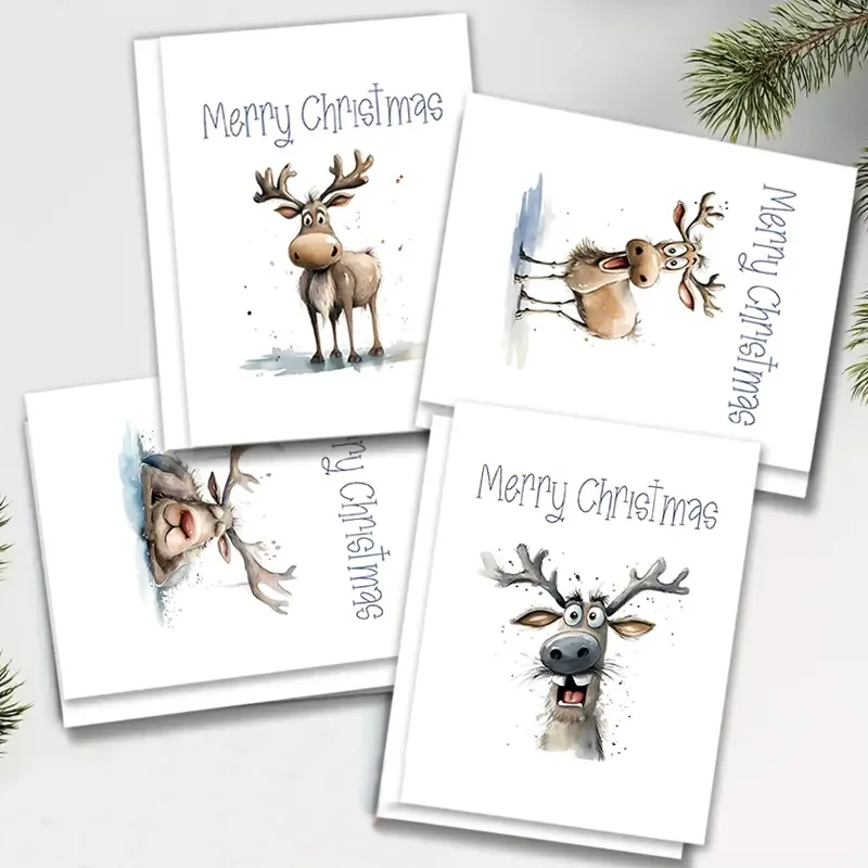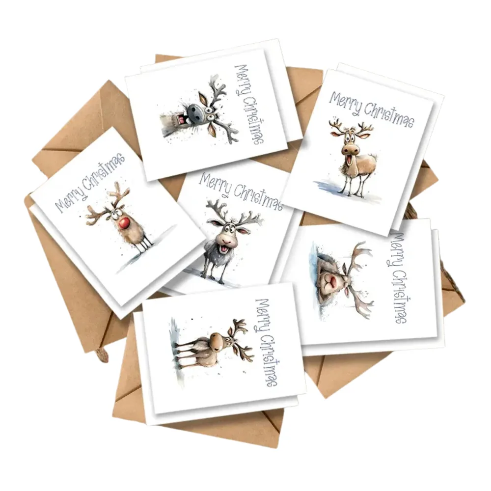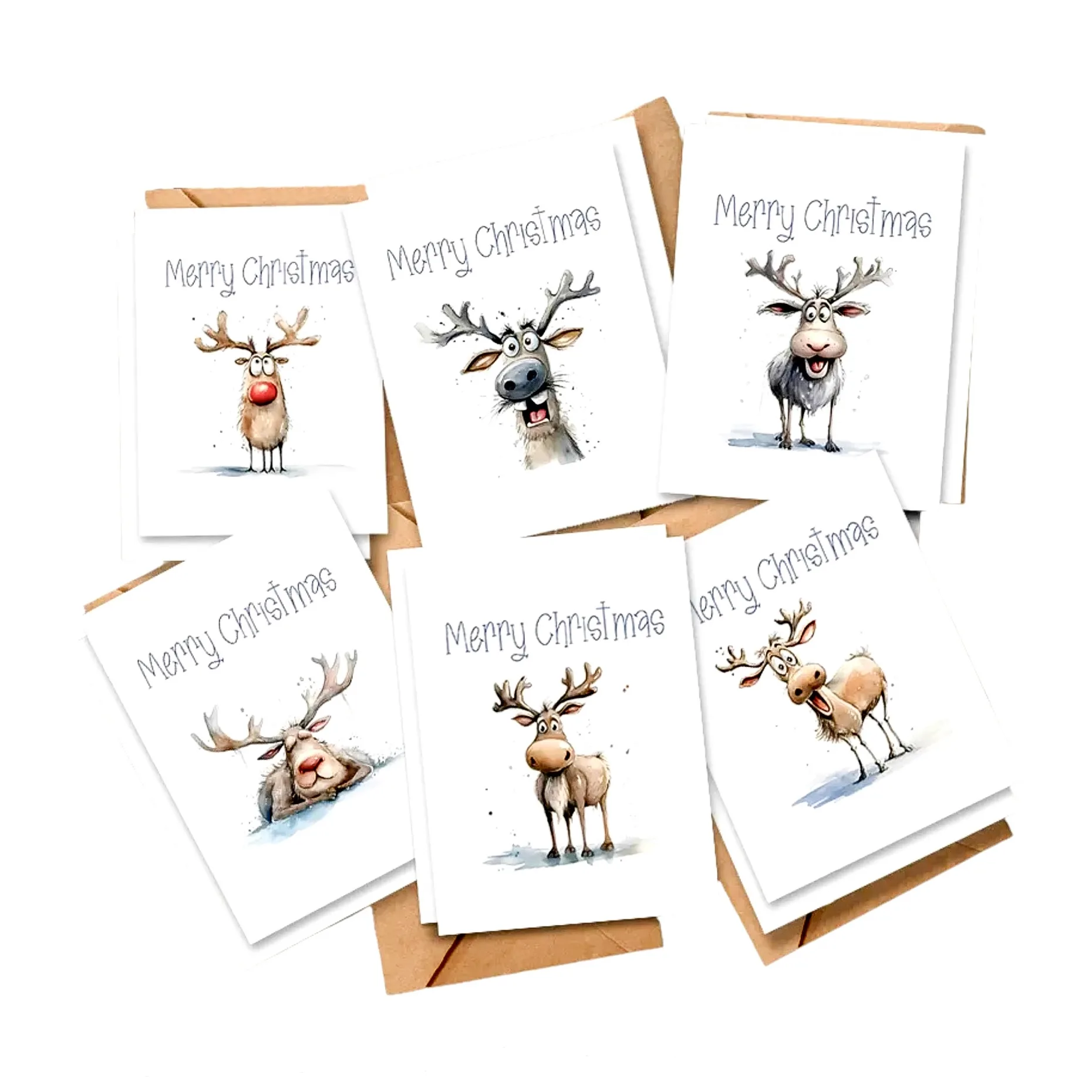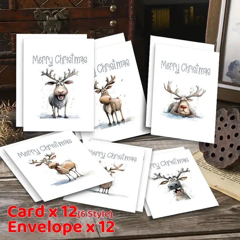 Set van 12 Grappige Kerstkaarten Rendier + Envelop