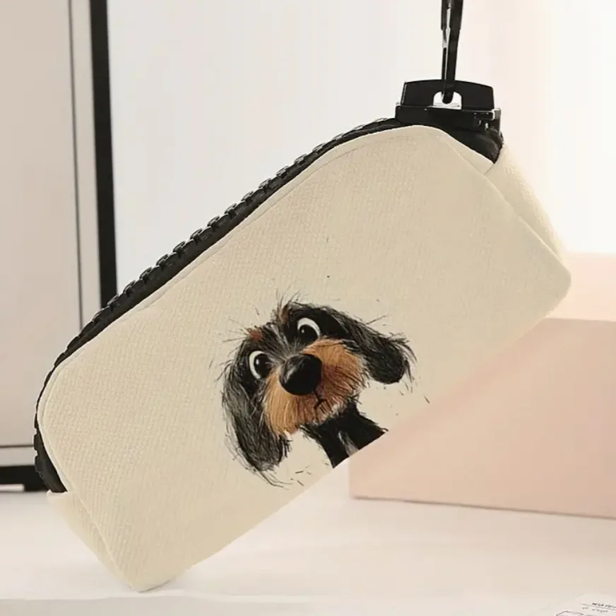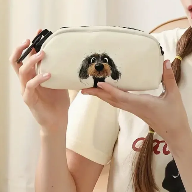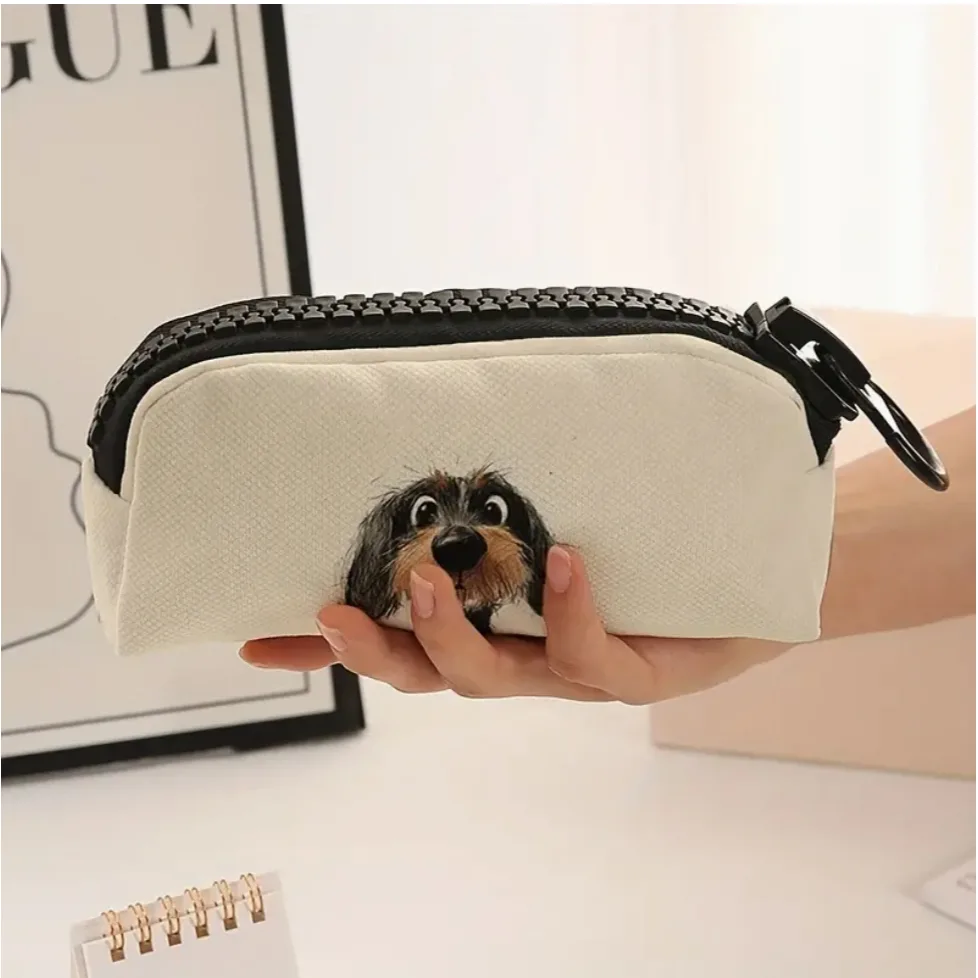 Deze schattige etui met een dubbelzijdige print van een hondje (teckel) is perfect voor kinderen die van dieren houden. Het is medium groot en biedt voldoende ruimte voor al je pennen en potloden. Met de grote rits kun je het etui makkelijk openen en sluiten, zodat je snel bij je spullen kunt.