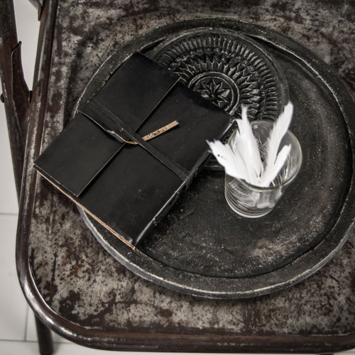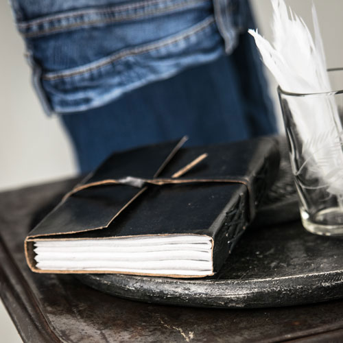 Het notitieboek heeft een kaft van zwart buffelleer. Het boek heeft ongeveer 180 bladzijdes van wit papier met een grove vezel. De bladzijdes zijn geschikt om te beplakken, beschilderen en te beschrijven met pen en potlood.De bladzijdes zijn gemaakt gerecycled papier. Het handgeschepte papier is wellicht iets grover dan je gewend bent. Op sommige pagina’s kun je zelfs de kleine details van de verwerkte materialen, zoals bloemetjes en stukjes plant, nog zien zitten!