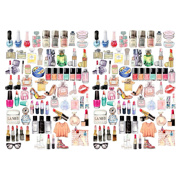 De stickervellen bevatten afbeeldingen van parfumflesjes, nagellak en nog veel meer.