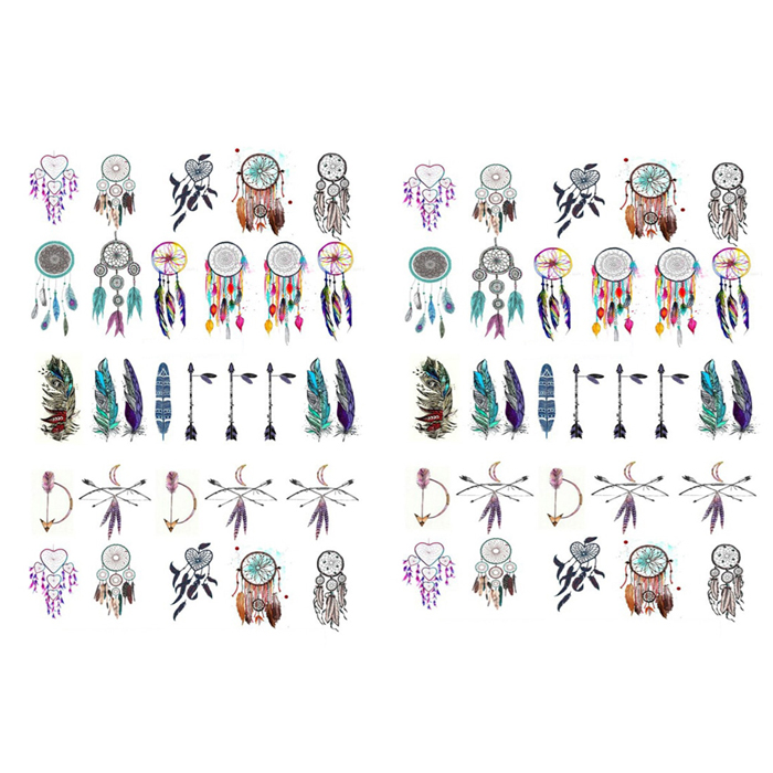 De stickervellen bevatten afbeeldingen van pijlen, dromenvangers en nog veel meer.