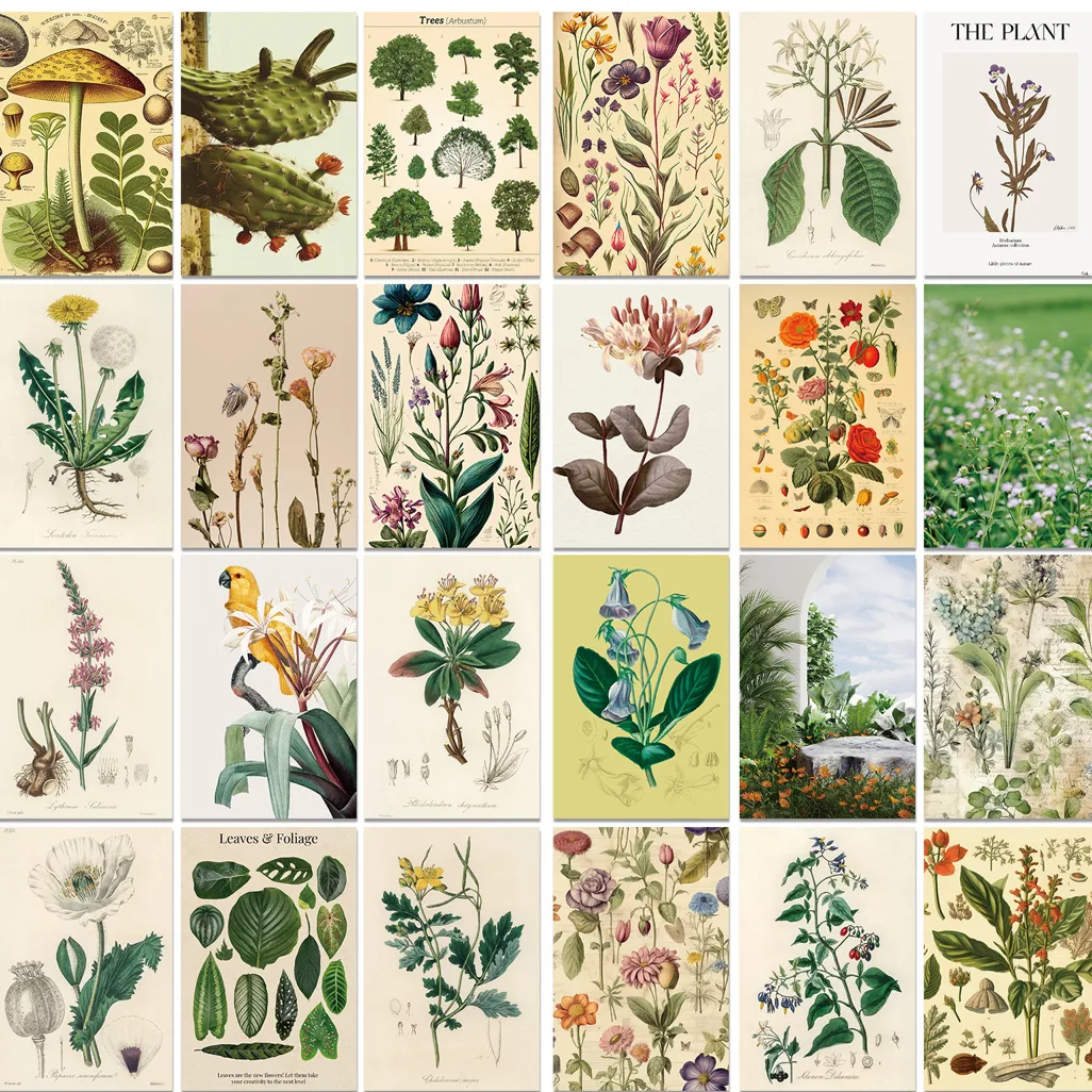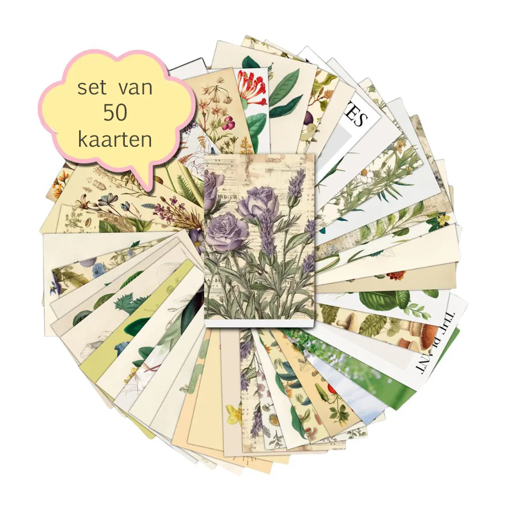 Deze set bevat maar liefst 50 verschillende kaarten met afbeeldingen van bloemen, planten, paddestoelen en vogels. Elk ontwerp is zorgvuldig geselecteerd om een unieke en inspirerende collectie te creëren. Of je nu graag kaarten verstuurt naar vrienden en familie, ze gebruikt voor knutselprojecten of ze aan de muur wilt ophangen als decoratie, deze set biedt eindeloze mogelijkheden.