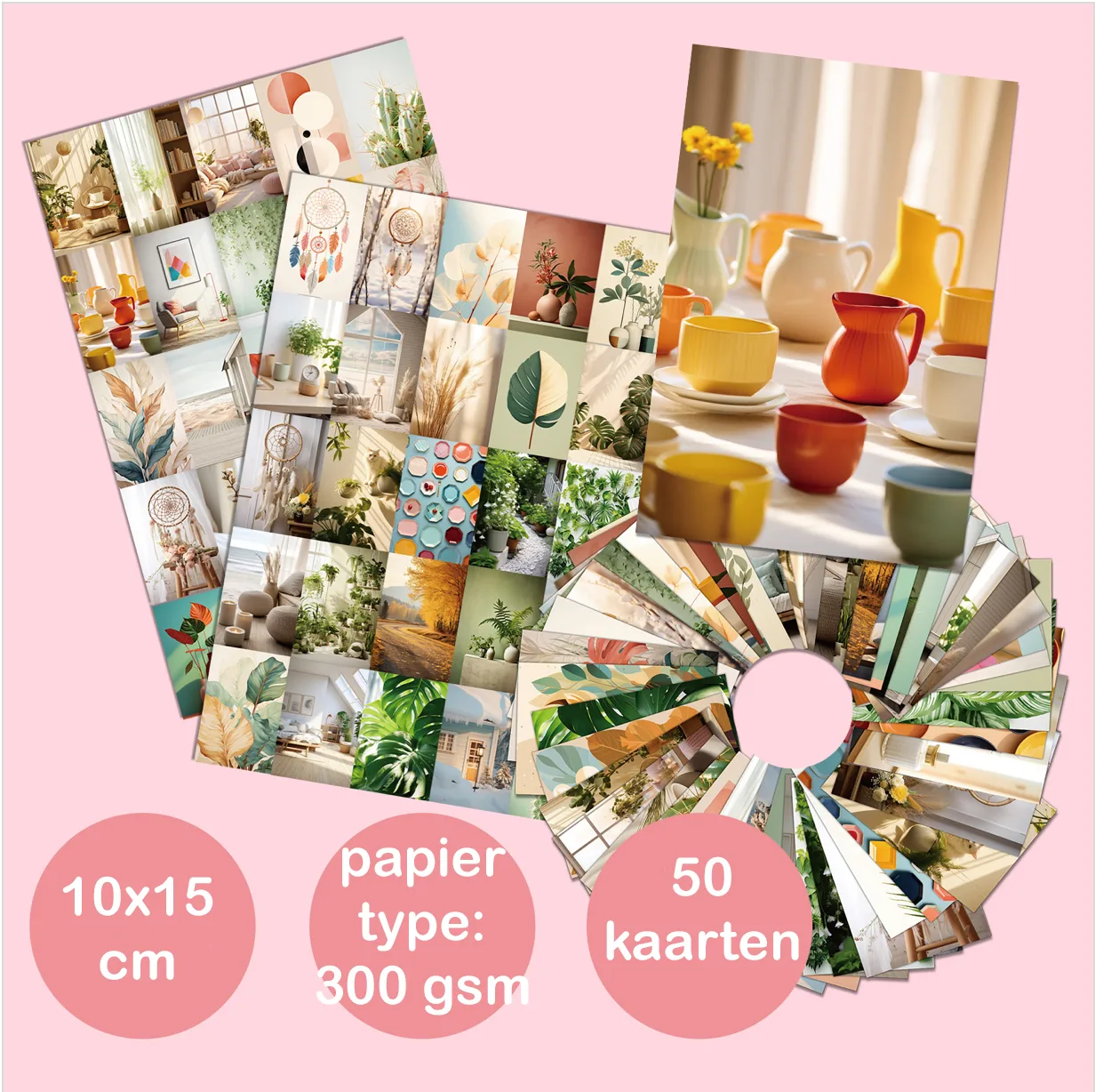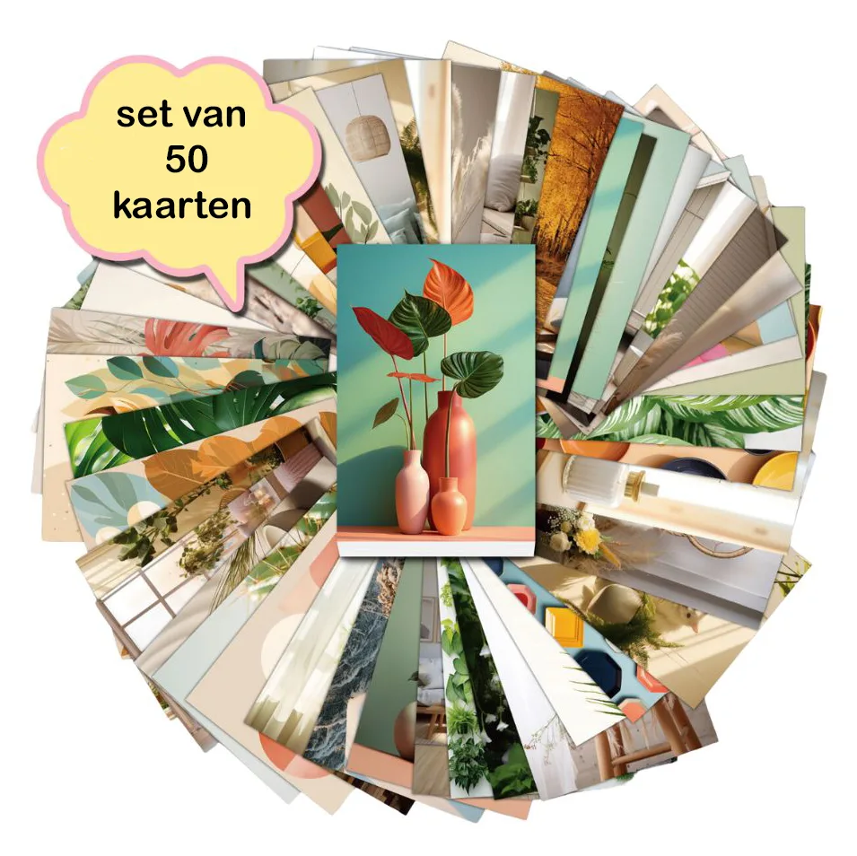 Deze set bevat maar liefst 50 verschillende kaarten met verschillende afbeeldingen van bijvoorbeeld bloemen en planten. Elk ontwerp is zorgvuldig geselecteerd om een unieke en inspirerende collectie te creëren. Of je nu graag kaarten verstuurt naar vrienden en familie, ze gebruikt voor knutselprojecten of ze aan de muur wilt ophangen als decoratie, deze set biedt eindeloze mogelijkheden.