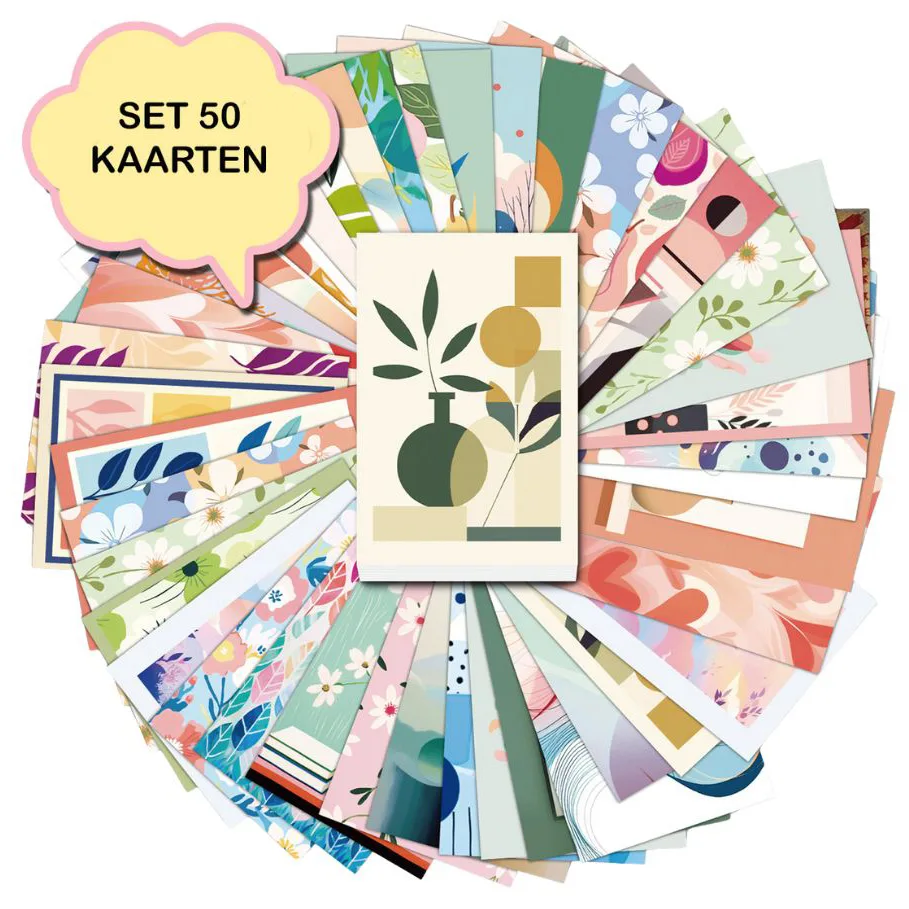 Ben jij een liefhebber van kaarten versturen, knutselen, scrapbooking of gewoonweg mooie kunst? Dan hebben wij dé perfecte set voor jou! Dit prachtige set van 50 verschillende ansichtkaarten in een pastelkleurig thema is een aanvulling aan je knutsel-collectie!