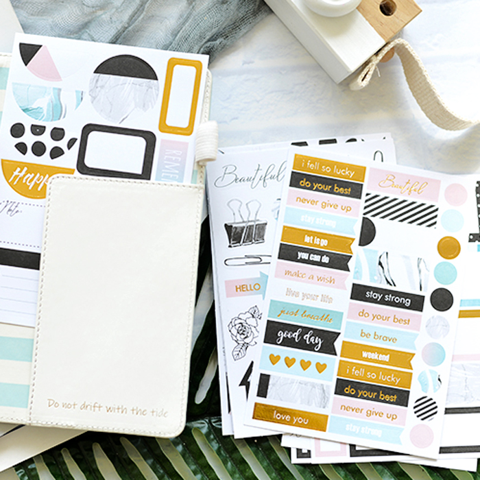 Je ontvangt 8 stickervellen met teksten zoals love, happy, en to do.