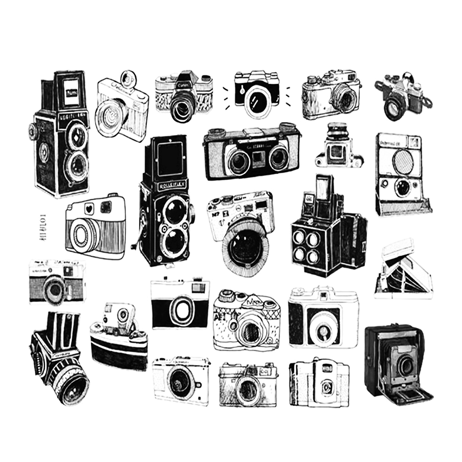 Je ontvangt een pakket met 1 stickervelle met verschillende vintage camera’s.