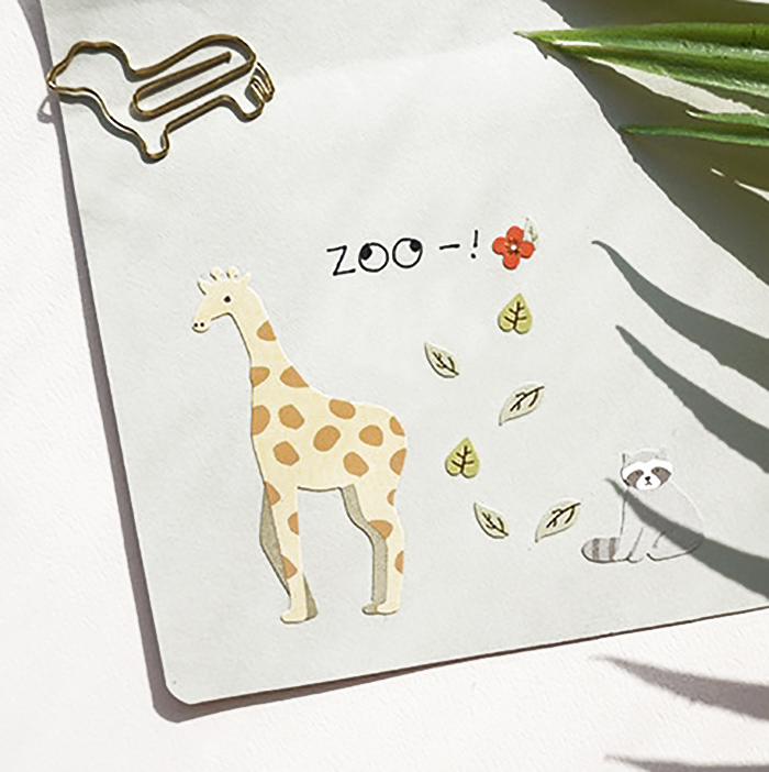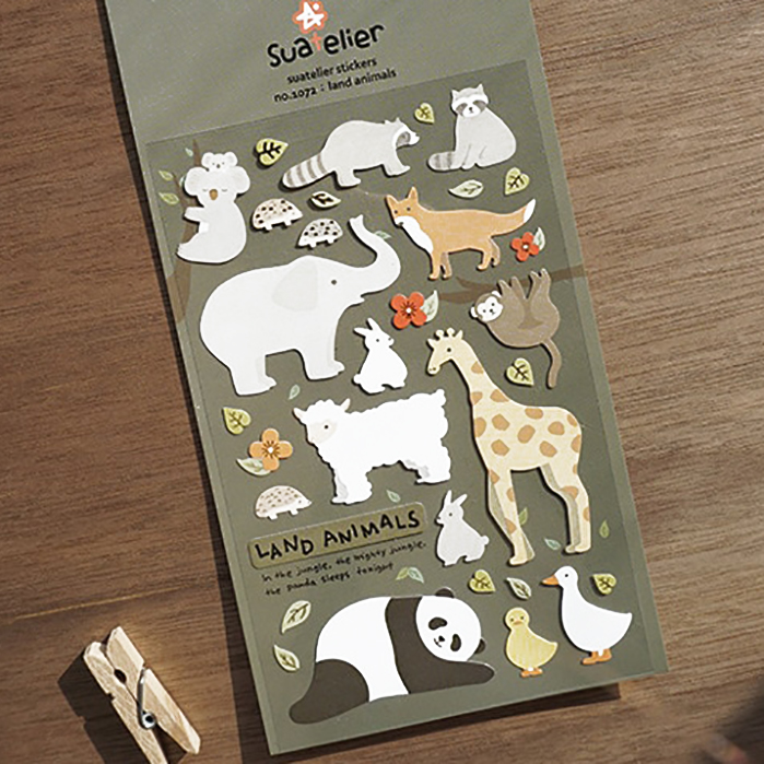 Zo ontvang je stickers met afbeeldingen van: een olifant, panda, koala, wasbeer, vos, eend, egel, schaap, aapje en een konijn.
