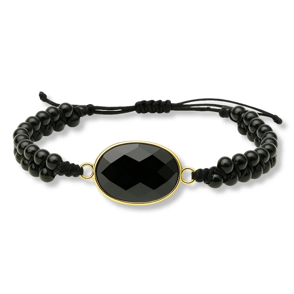 De Marama Armband Agaat Zwart, speciaal ontworpen voor dames die houden van een vleugje luxe. Deze prachtige damesarmband combineert een ovale hoofdsteen van agaat zwart met een gouden omlijsting, wat een verfijnde uitstraling geeft. Met zijn verstelbare ontwerp van 17 tot 22 cm past deze armband perfect om elke pols.