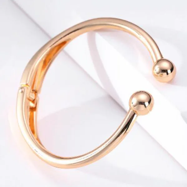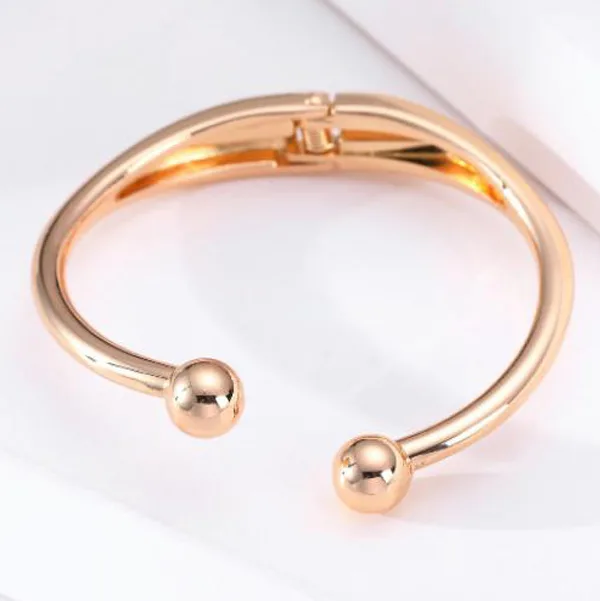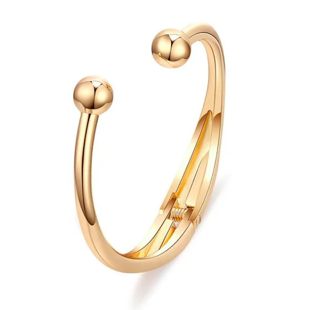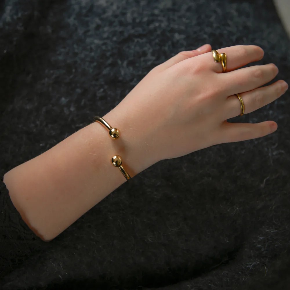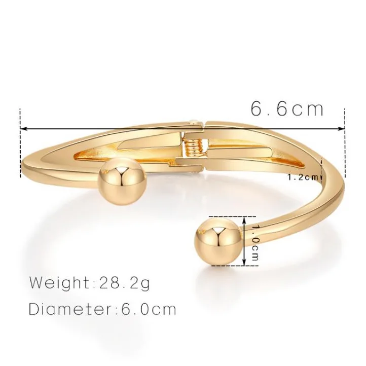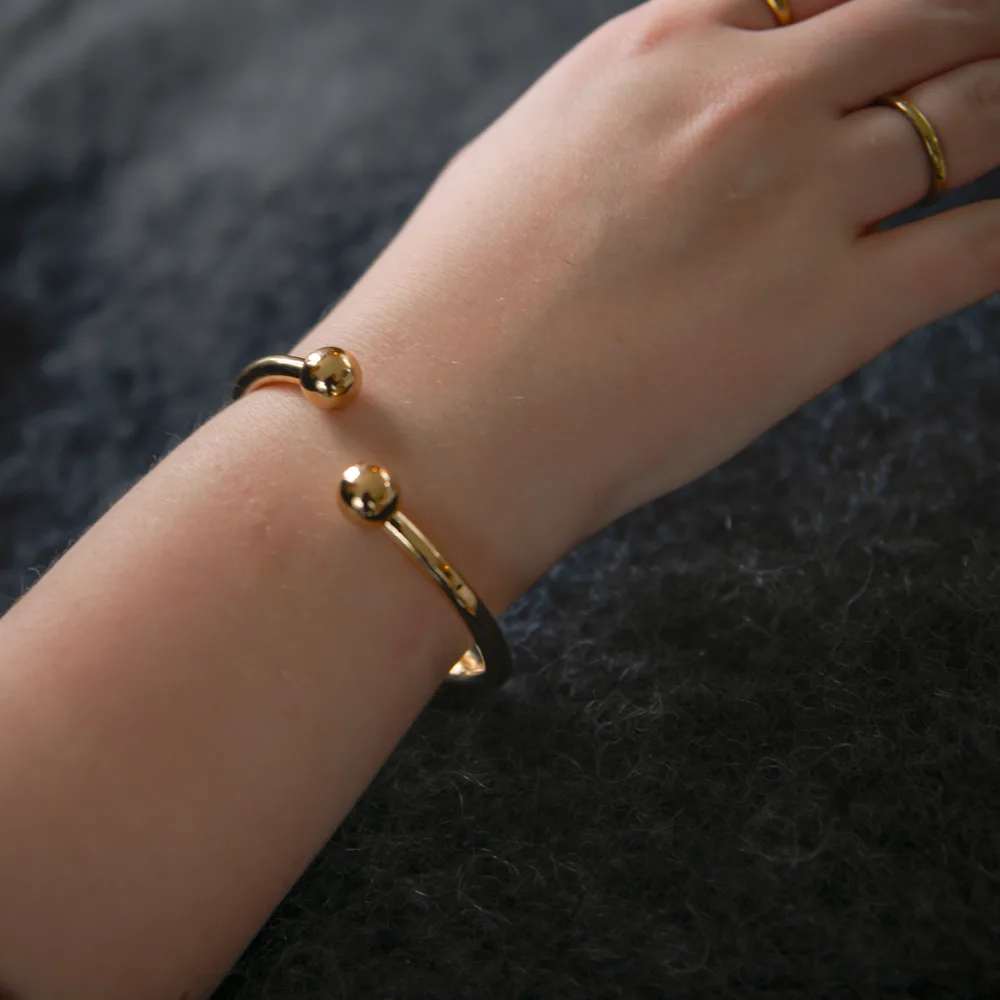 De Armband Ayla is een elegante bangle in goud, ontworpen voor de stijlvolle vrouw die houdt van verfijning en luxe. Deze damesarmband is gemaakt van stainless steel en heeft een prachtige gold plated afwerking, wat zorgt voor een stralende en chique uitstraling. De scharnier sluiting biedt gemak en comfort, terwijl de twee bolletjes aan de zijkanten de armband een subtiel, maar stijlvol detail geven. De Armband Ayla is perfect voor een avond uit of elke feestelijke gelegenheid, waarbij je zeker de aandacht zult trekken. Voeg een vleugje glamour toe aan je look met deze tijdloze, elegante bangle.