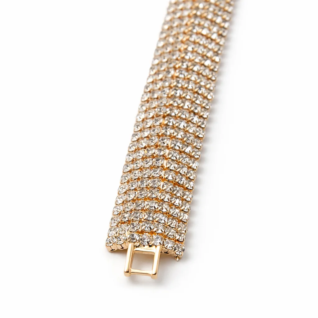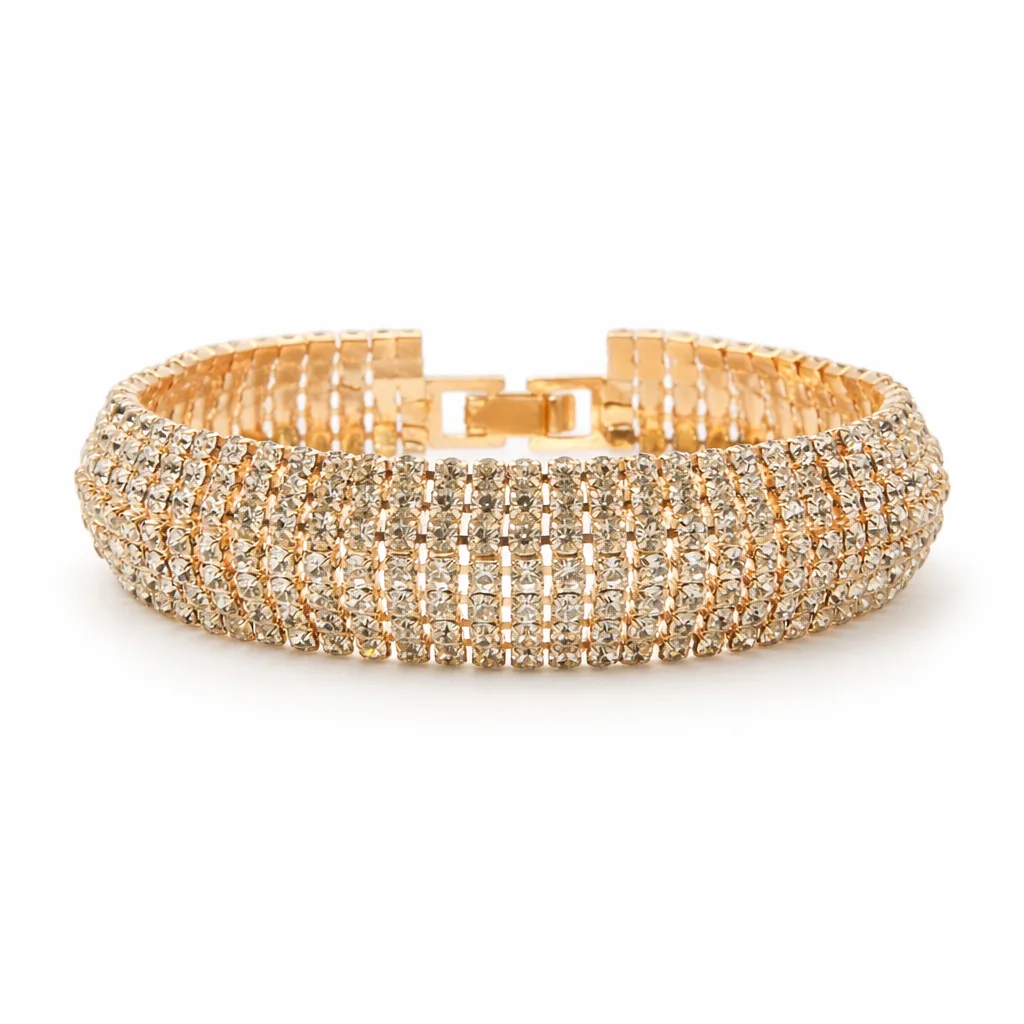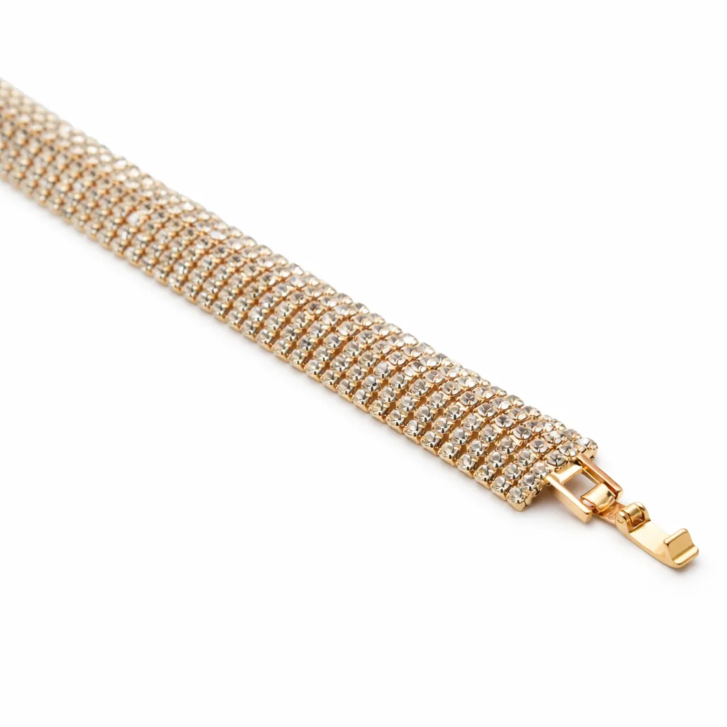 Laat je pols stralen met de elegante Ella armband. Deze schitterende damesarmband is rijk bezet met fonkelende rhinestones en heeft een luxe goudkleurige afwerking. Perfect voor feestelijke gelegenheden, maar ook prachtig als stijlvolle eyecatcher bij je dagelijkse outfit. Dankzij het lichte gewicht en de hypoallergene koperlegering draag je de armband comfortabel de hele dag door.
