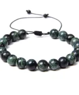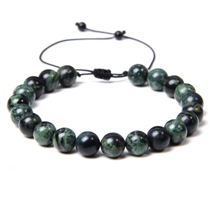 Deze prachtige handgemaakte armband is gemaakt van vegan waxcord en kralen vervaardigd uit de groen-zwarte Kambaba Jaspis edelsteen. Door de stevige treksluiting is deze minimalistische armband gemakkelijk en comfortabel in gebruik. De handgemaakte armbanden zijn vanwege de hypoallergene eigenschappen ideaal voor mensen met een gevoelige huid en wie last heeft van metaalallergie. Deze handgemaakte armbanden zijn stuk voor stuk uniek!