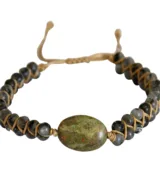 Deze schitterende vegan armband is handgemaakt van bruin vegan waxcord en edelstenen. De armband is vervaardigd van Jaspis edelstenen in de kleuren groen, roze en grijs. Een trendy armband met een vrouwelijke touch! Perfect te dragen door dames. Het lichtbruine waxcord heeft een verstelbare sluiting, waardoor de armband draagbaar is voor zowel smalle als bredere polsen. Deze armband wordt geleverd in een luxe geschenkverpakking.