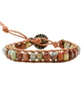 De warme tinten van de jaspis stenen stralen rust en kracht uit, terwijl het soepele leer zorgt voor een comfortabele pasvorm en duurzame kwaliteit. De bloemvormige sluiting van verzilverd metaal geeft de armband een verfijnde, vrouwelijke touch.