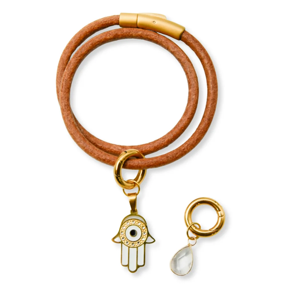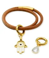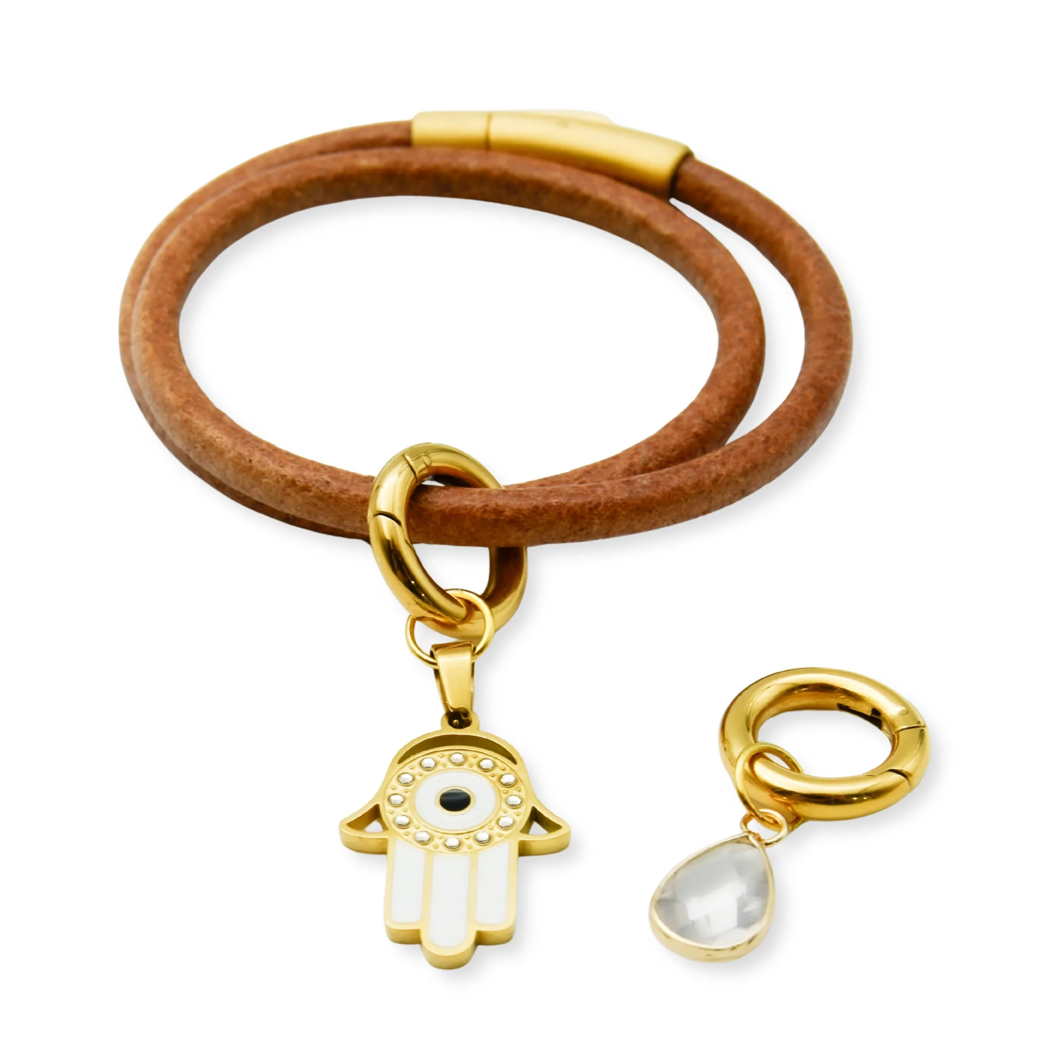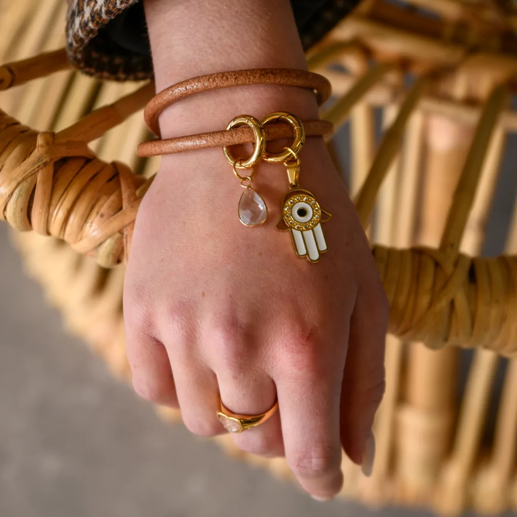 - 2 afneembare hangers: Personaliseer je look met een kristal edelsteen en een hamsa handje met strass steentjes. De hangers zijn afneembaar, dus je kunt gemakkelijk wisselen of beide hangers aan je armband bevestigen.