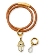 Ontdek de prachtige Marama Wikkelarmband Leer Hamsa-Crystal, speciaal ontworpen voor dames die houden van een stijlvolle en persoonlijke touch. Deze handgemaakte armband wikkel je twee keer om je pols voor een speelse en unieke look. Het lichtbruine leer is zacht en comfortabel, perfect voor dagelijks gebruik en gemakkelijk te sluiten met de stevige mat gouden klik-sluiting.
