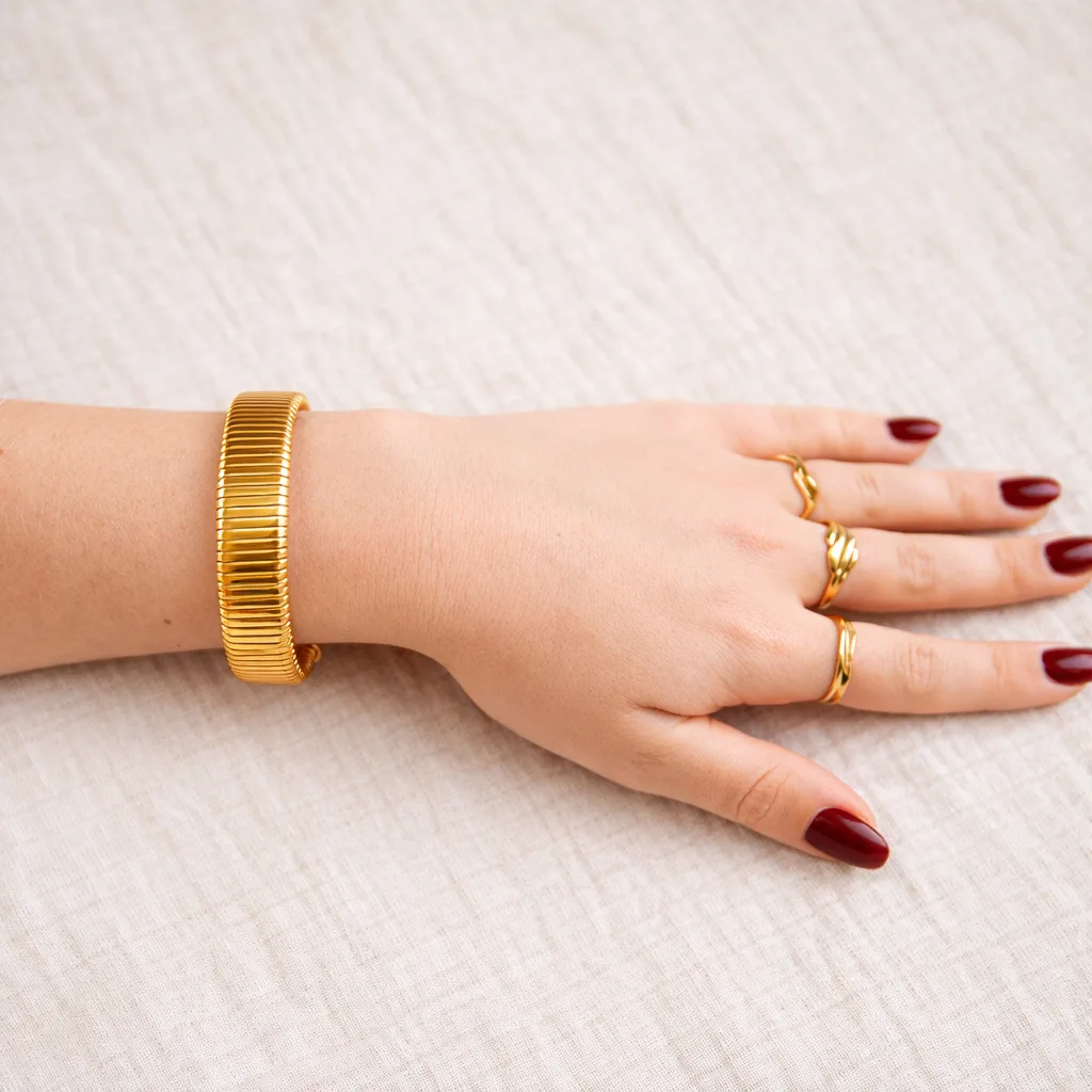 Breng moeiteloze elegantie in elke outfit met de Luna Stainless Steel Dames Armband. Deze brede goudkleurige bangle is ontworpen voor vrouwen die houden van krachtige eenvoud met een stijlvolle uitstraling. Het strakke design gecombineerd met hoogwaardig stainless steel maakt deze damesarmband tot een statement piece dat jarenlang mooi blijft.