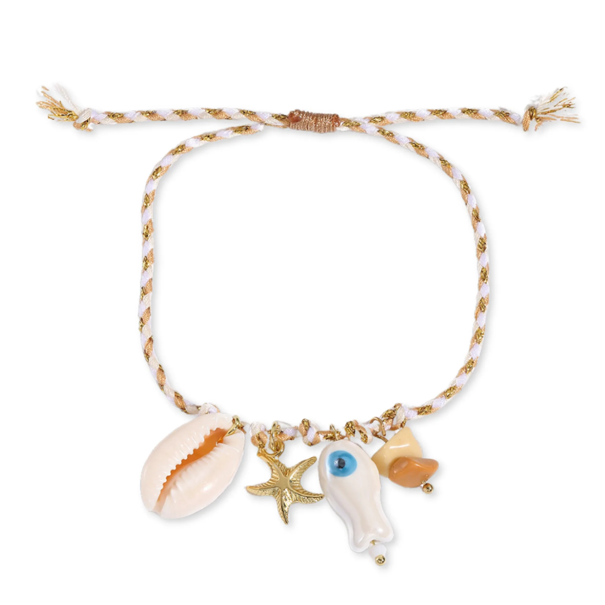 De armband is ideaal voor een dagje naar het strand. Het ontwerp met bedeltjes, waaronder een schelpje, visje en zeester, voegt een speelse touch toe aan je outfit. Deze elementen maken het perfect voor elke gelegenheid tijdens de zomer.