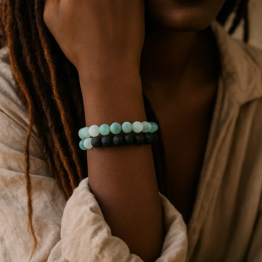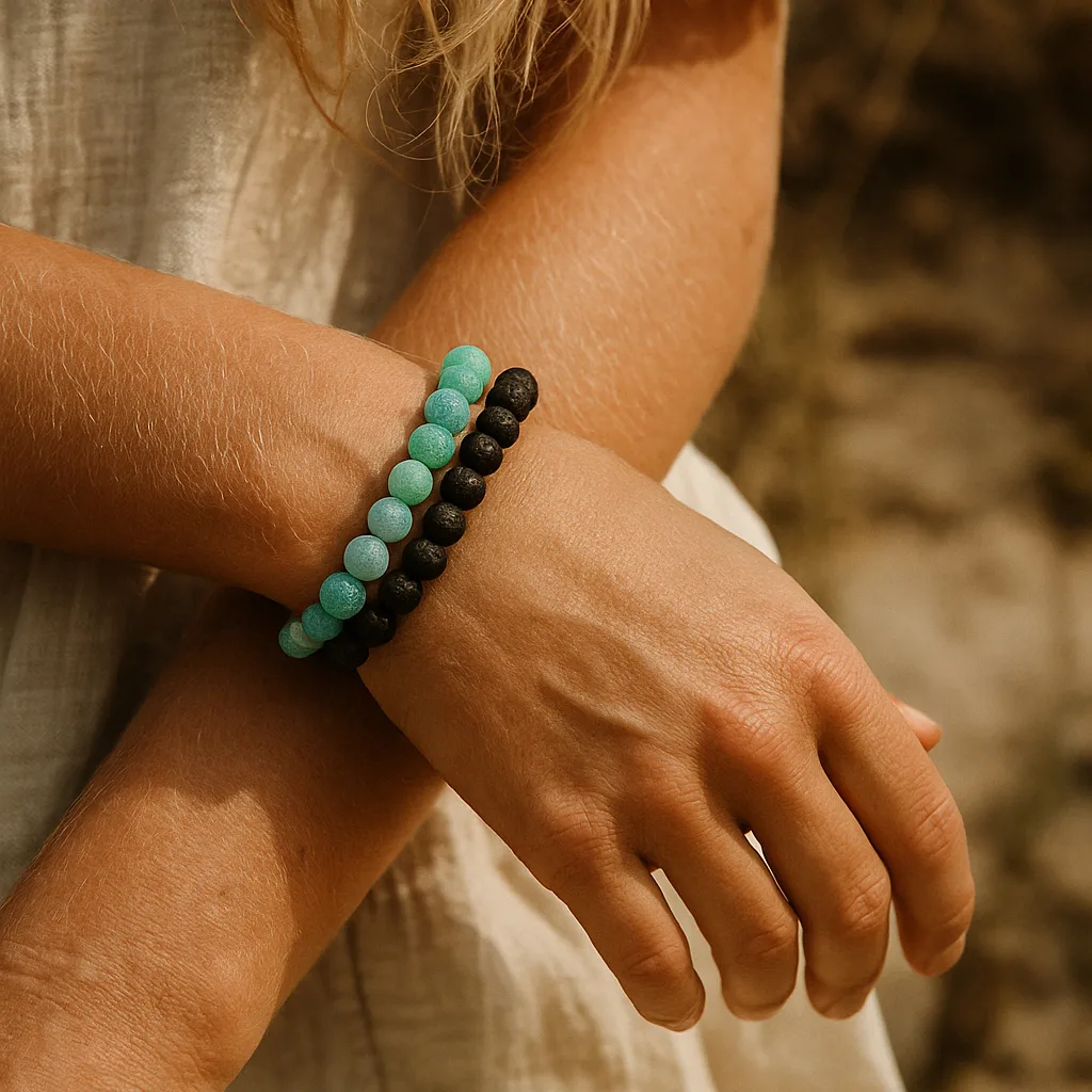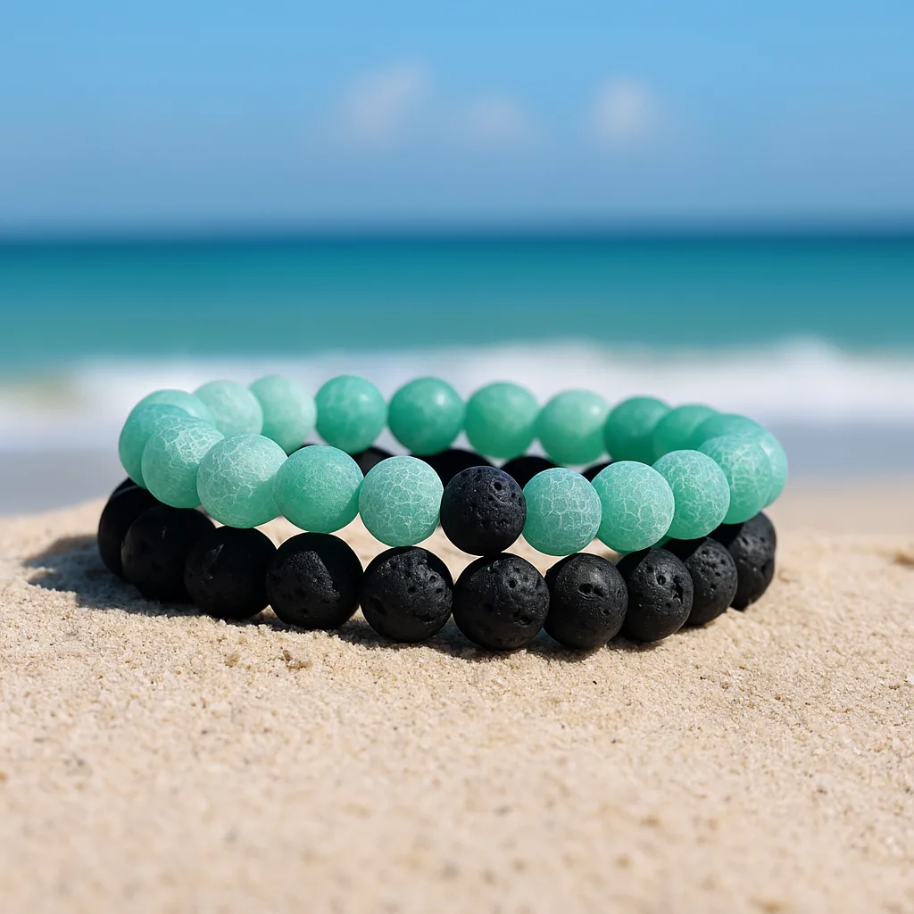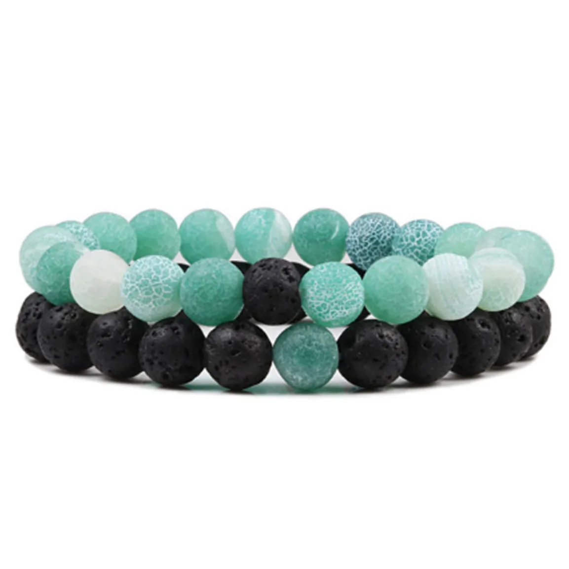 Het armbanden set is handgemaakt van echte agaatstenen en lavasteen, met een diameter van 8 mm, zorgvuldig geselecteerd op kleur en tekening. De kralen hebben groene en zwarte tinten , waardoor elke set uniek is.