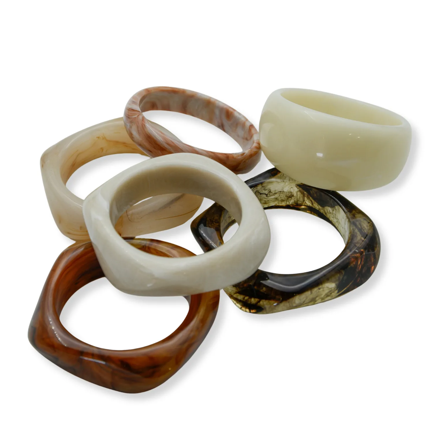 Deze bangle set van 2 is dé perfecte toevoeging aan jouw sieradencollectie! De combinatie van crème- en bruin kleurige tinten met een verfijnd marmer effect geeft deze armbanden een luxe en elegante uitstraling. De grove afwerking zorgt voor een gedurfde look, ideaal voor vrouwen die houden van opvallende accessoires.