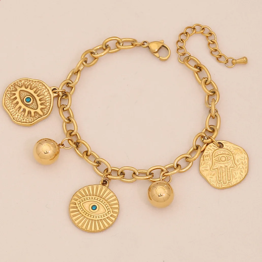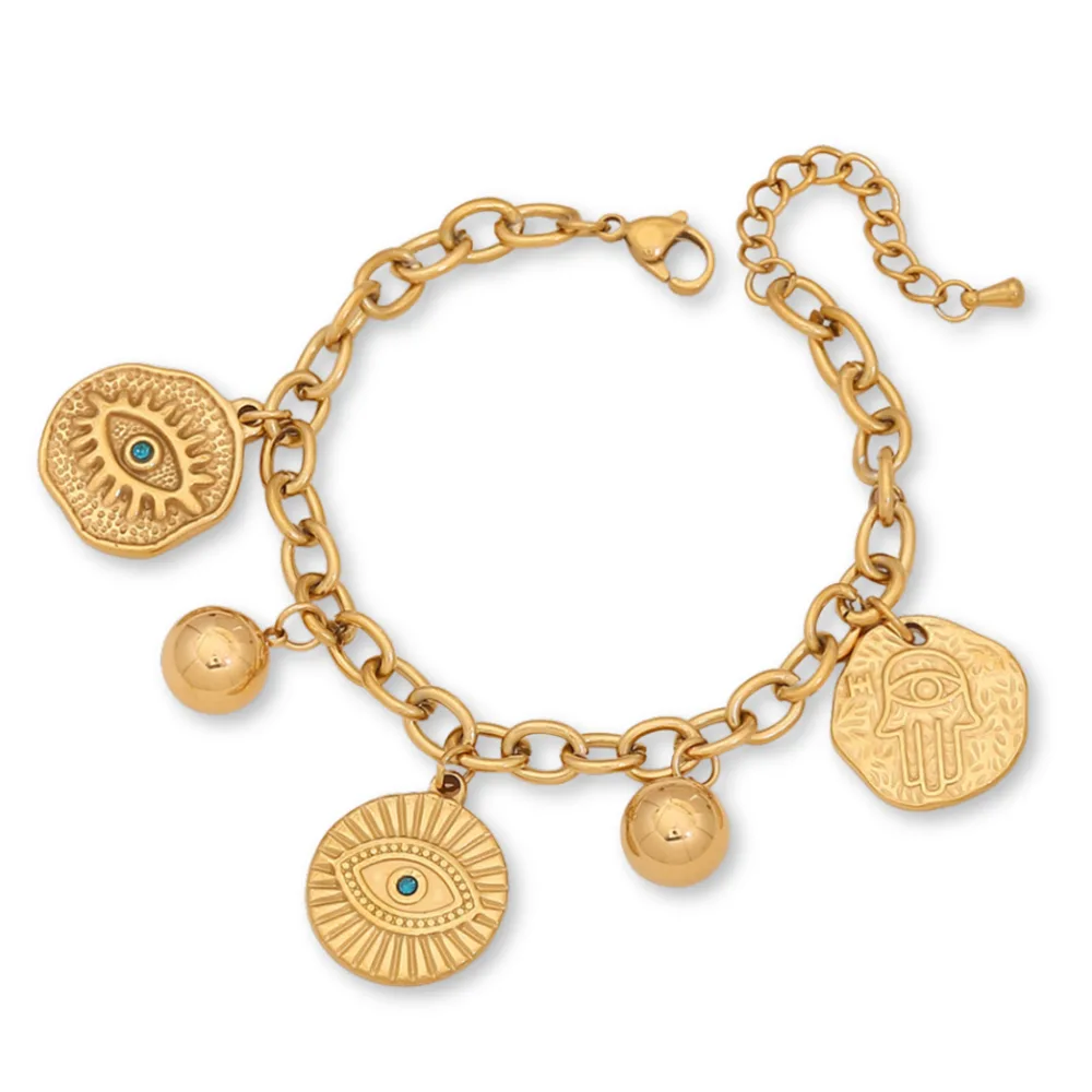 - De armband is voorzien van vijf bedels: twee oogjes, twee balletjes en een hamsa-handje.