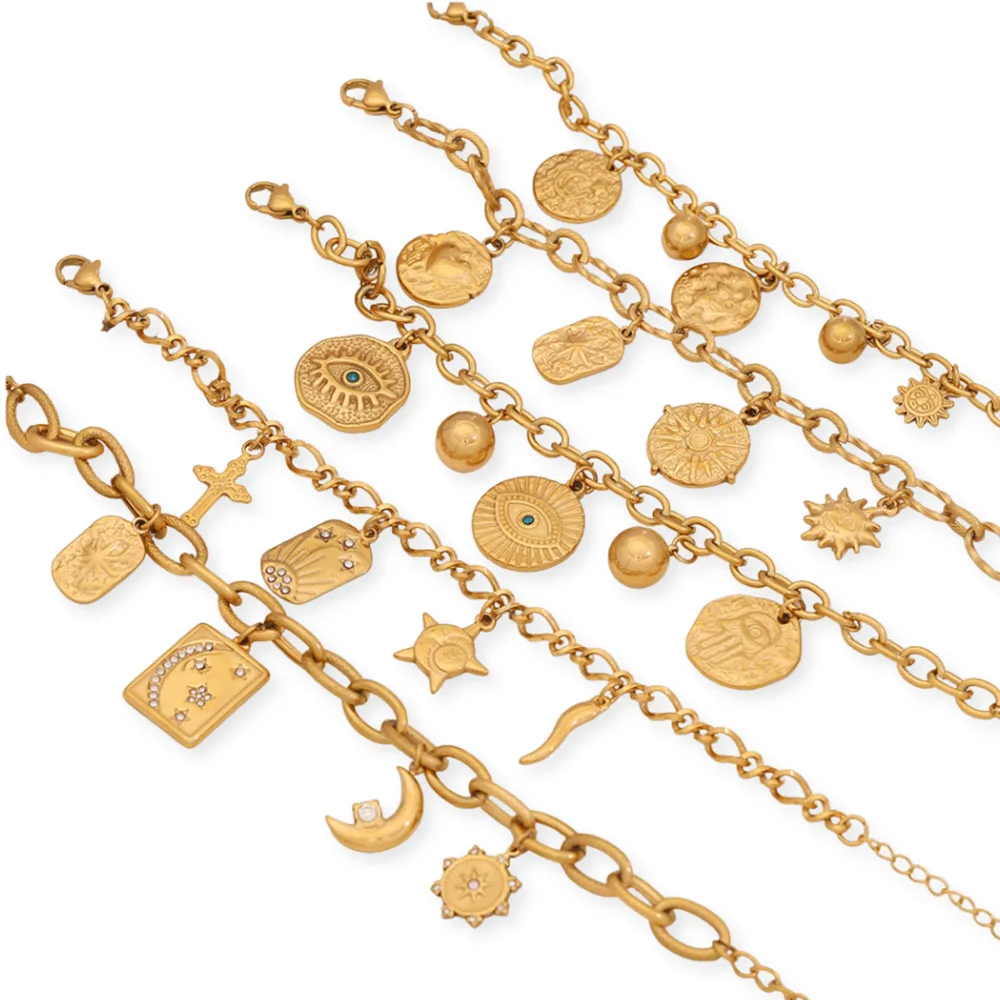 Deze bedelarmband is de perfecte aanvulling op je zomeroutfit. De combinatie van de zonnige bedels en de gouden plating geeft een frisse en vrolijke uitstraling. Het ontwerp vangt de essentie van zonnige dagen en zorgeloze momenten.