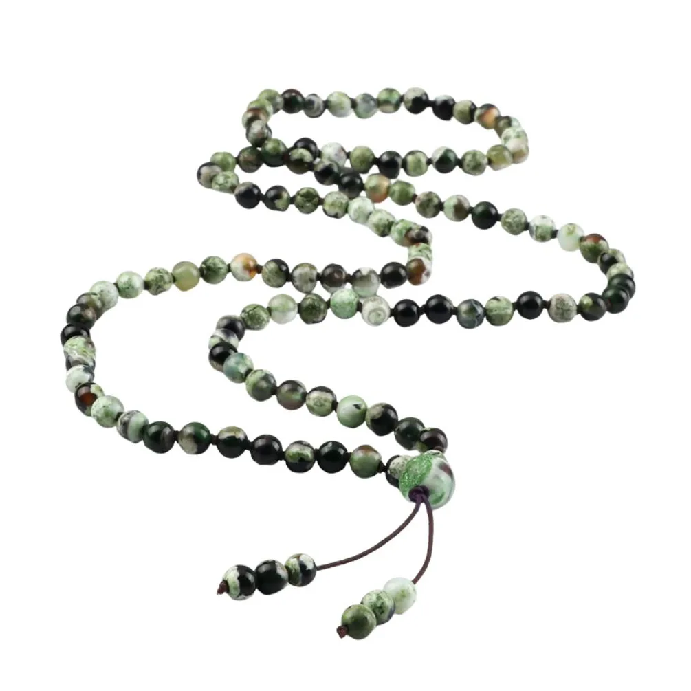 Deze stijlvolle elastische Mala armband is voorzien van kralen vervaardigd uit de edelsteen Agaat, in blauwe, groene en zwarte tinten. De elastische armband wikkel je een aantal keer om je pols, en kan ook als ketting worden gedragen. De ketting beschikt over 108 natuurlijke kralen van 6 mm, en 1 kraal van 10 mm. Deze handgemaakte armbanden zijn stuk voor stuk uniek! Een elegant design dat geschikt is voor dames en heren. Je ontvangt deze armband in een luxe geschenkdoos.