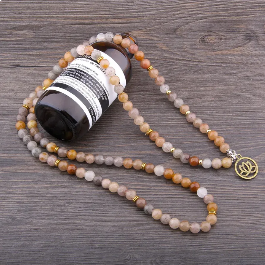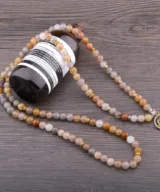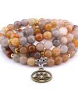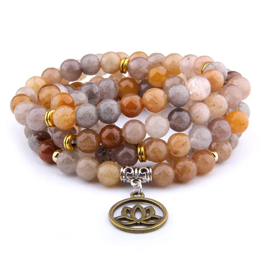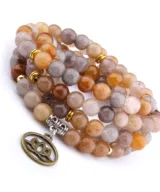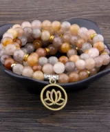 Deze stijlvolle elastische Mala armband is voorzien van kralen vervaardigd uit de edelsteen Carneool (een kwartssoort), in oranje, grijze en bruine tinten. De elastische armband wikkel je een aantal keer om je pols, en kan ook als ketting worden gedragen. De ketting beschikt over 108 natuurlijke kralen van 8 mm, goudkleurige en zilverkleurige kralen en een lotushanger van brons. Deze handgemaakte armbanden zijn stuk voor stuk uniek! Een elegant design dat geschikt is voor dames en heren. Je ontvangt deze armband in een luxe geschenkdoos.