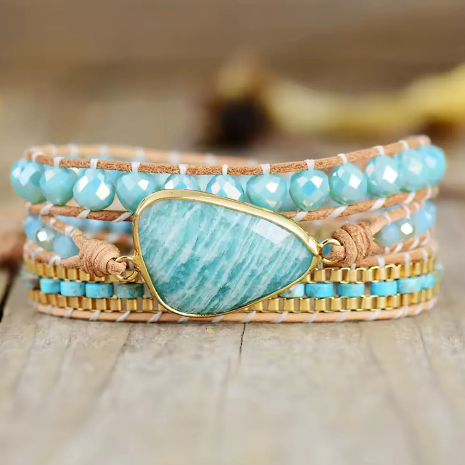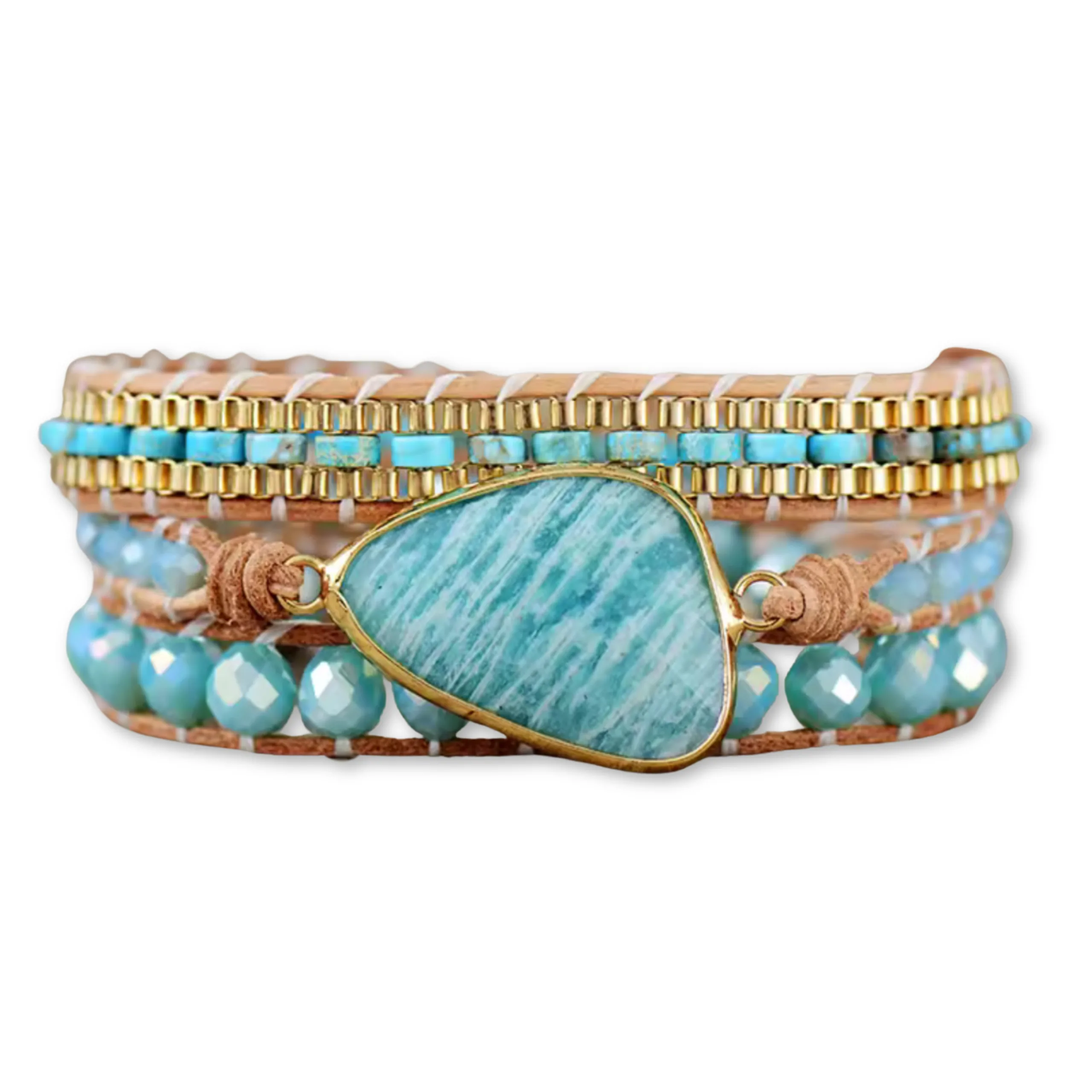 Met de Marama Wikkelarmband Blue Lake draag je altijd een stukje natuur bij je. De blauwe tinten van de edelstenen roepen beelden op van serene meren en rustgevende landschappen. Deze armband is niet alleen mooi om te zien, maar ook betekenisvol, dankzij de helende eigenschappen die vaak aan amazoniet worden toegeschreven.