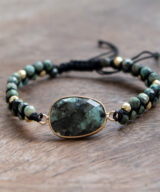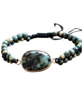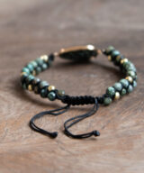 Deze schitterende vegan armband is handgemaakt van zwart vegan waxcord en edelstenen. De groen-zwarte edelsteen en kleine kralen zijn vervaardigd van Afrikaanse Turquoise Jaspis. Een stijlvolle aanvulling aan je outfit, zowel casual of chique! De armband van zwart waxcord heeft een verstelbare treksluiting, dus one size fits alll! Geef je zelf of iemand anders deze armband cadeau in onze luxe geschenkverpakking.